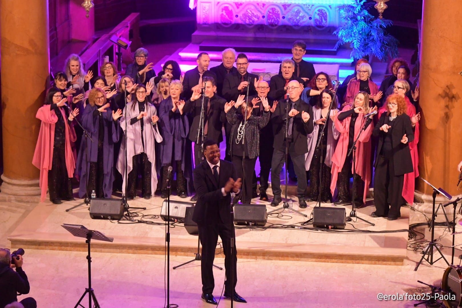 Due ore di musica coinvolgente, di divertenti siparietti ma anche di riflessione, durante le quali Trini Lopez Massie ha saputo coinvolgere il numeroso pubblico accorso. Grandi e piccoli hanno battuto le mani al ritmo della musica della band che ha accompagnato il coro e che, per l’occasione, ha visto tra le sue fila un artista d’eccezione: Ananias Montague, tastierista e amico di Trini Lopez. Il pubblico ha cantato, riso e applaudito la performance degli Harmony Gospel Singers, sapientemente diretti dalla direttrice Stefania Mauro.