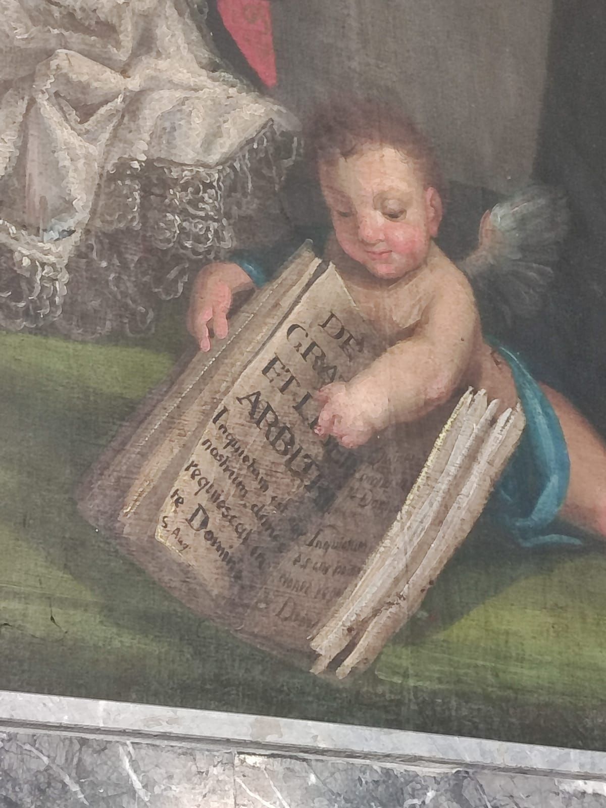 Mi soffermo in particolare sul libro aperto, in mano ad un putto che sta in basso al centro della pala della Madonna della Cintura. Leggiamo: De Gratiam et de Libero Arbitrio e più sotto “Inquietun est cor nostrum donec requiescat in te Domine” (il mio cuore è sempre inquieto finché non riposa in te Signore) e più sotto ancora S. Aug.