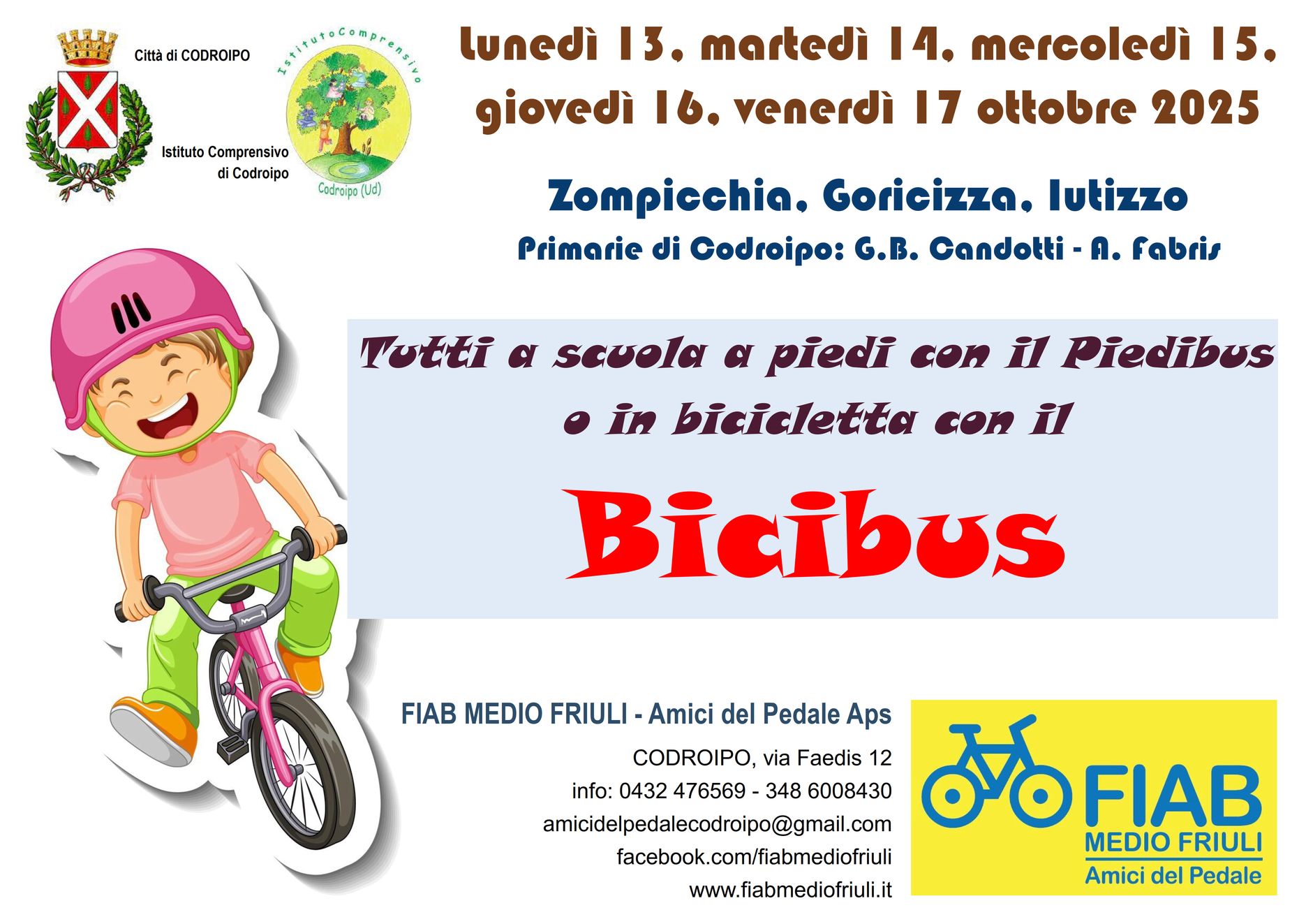 Il Bicibus, rivolto agli scolari delle Primarie delle scuole di Codroipo e organizzato da FIAB Medio Friuli - Amici del Pedale in collaborazione con il Comune e la Direzione delle Scuole di Codroipo, si terrà nella settimana dal lunedì 13 al venerdì 17 ottobre, su tre distinti percorsi partendo da Iutizzo, Zompicchia e Goricizza.