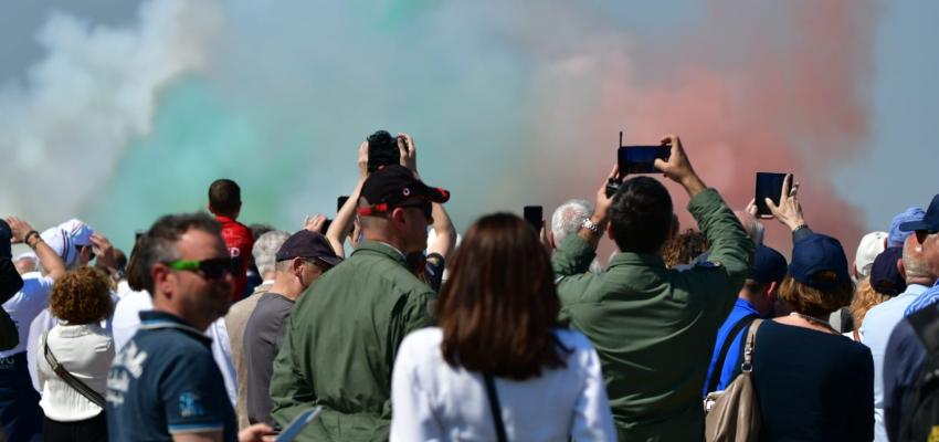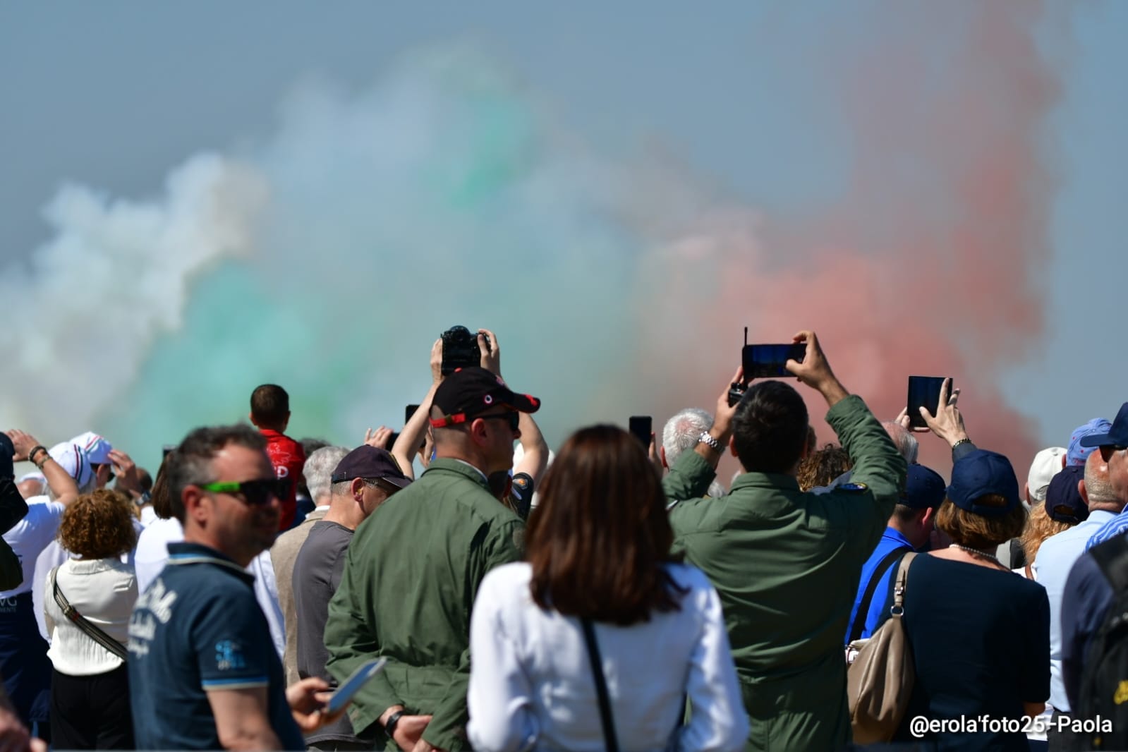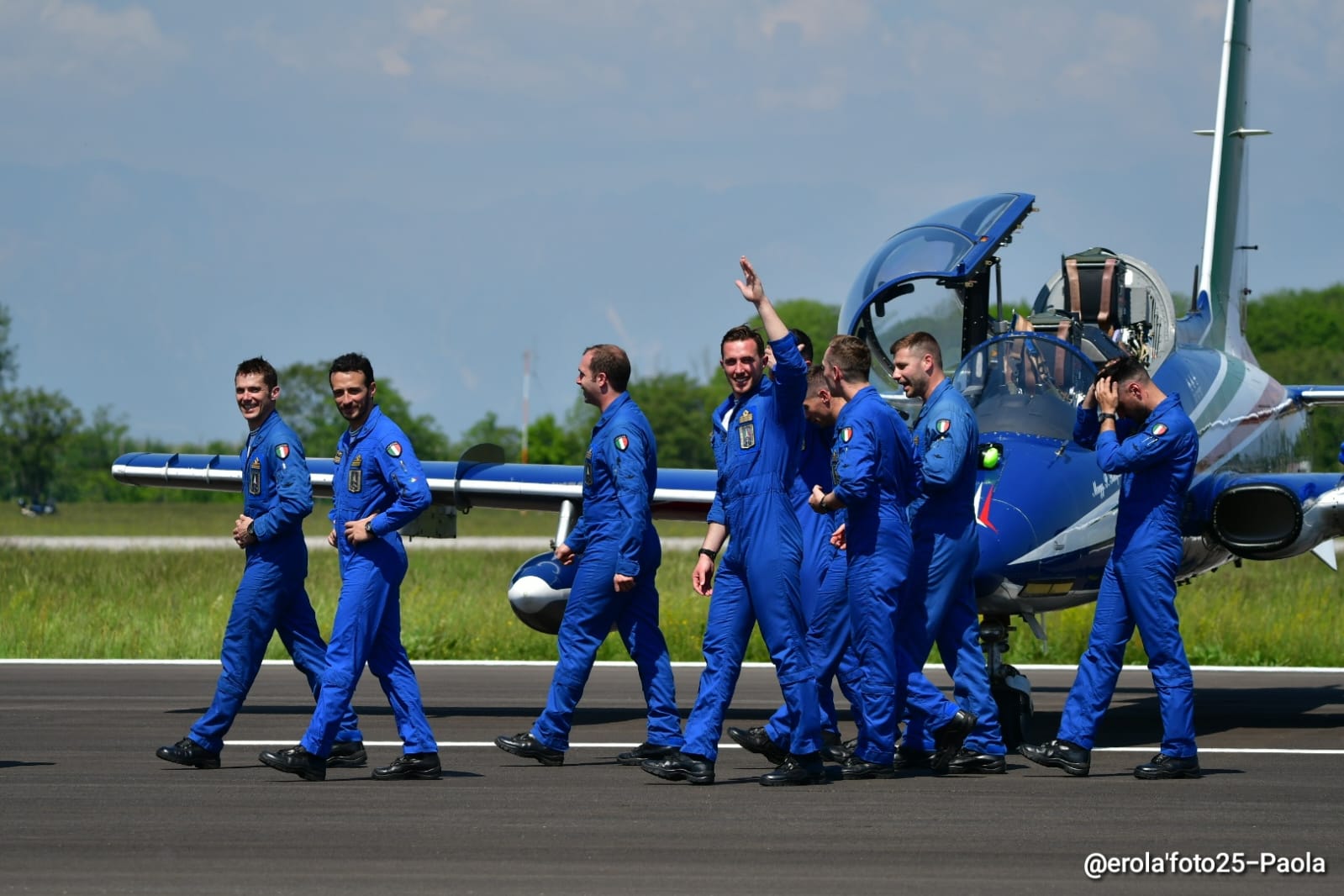 Solito controllo a borse e zaini e ci appostiamo in area stampa. Quattro chiacchiere con i colleghi e amici per passare il tempo ed ecco il pullman dei piloti. Scendono, qualcuno saluta, altri sono concentrati e un po' tesi, ma è normale: non è facile far parte della pattuglia Acrobatica numero uno al mondo. Qualcuno li chiama, altri chiedono una foto di gruppo ma niente da fare. Si avviano verso i loro "destrieri", gli Aermacchi Mb339, da 43 anni alla PAN e non dimostrarli.