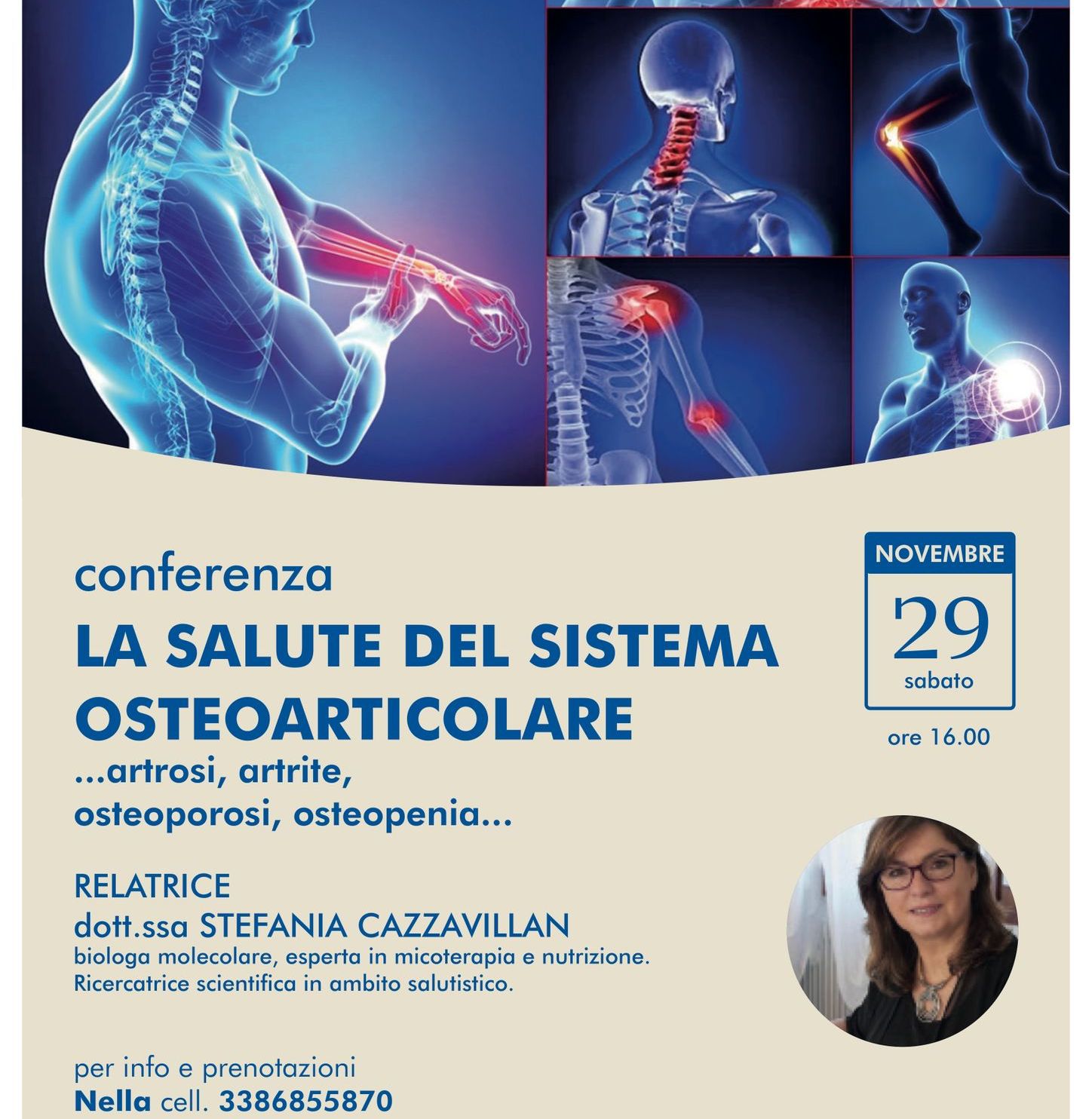 Conferenza su artrosi, artrite, osteoporosi, osteopenia con la dott.ssa Stefania Cazzavillan, biologa molecolare, esperta in micoterapia e nutrizione, e ricercatrice scientifica in ambito salutistico.