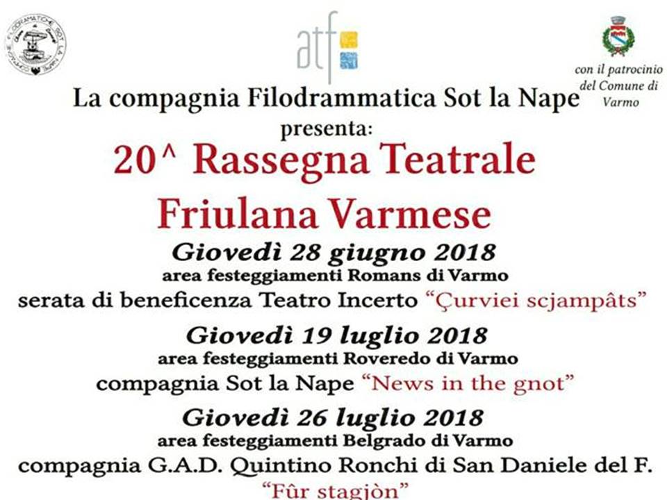È arrivata l’estate e, come di consueto, a Varmo è tempo di teatro all’aperto con la 20° Rassegna Teatrale Friulana Varmese a cura della compagnia filodrammatica Sot la Nape, che per quest’anno ha organizzato un cartellone di ben 6 serate, grazie al sostegno della Banca Ter, al patrocinio del Comune di Varmo e dell’Associazione Teatrale Friulana e alla collaborazione delle varie pro loco.