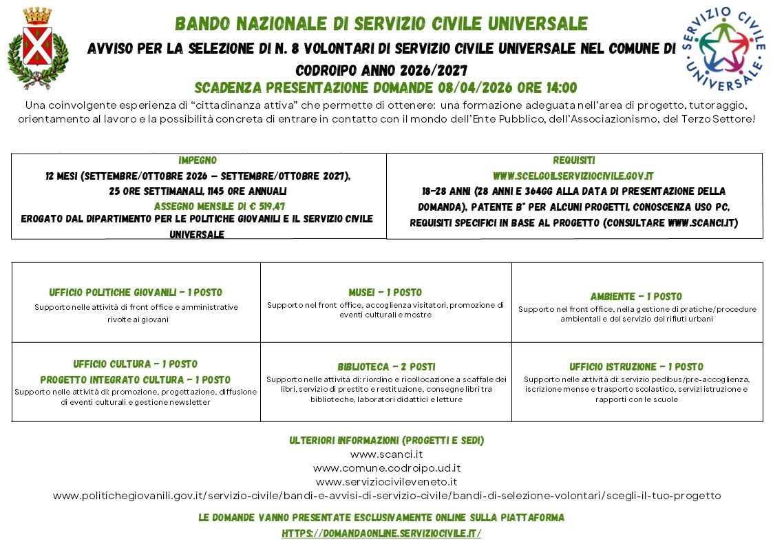 PROROGA DOMANDE SERVIZIO CIVILE NUOVA DATA DI SCADENZA GIOVEDI' 16/04/2026 TUTTE LE INFO SONO RIPORTATE ALLA PAGINA DEL SITO COMUNALE: https://www.comune.codroipo.ud.it/it/novita-224004/notizie-224005/bando-servizio-civile-universale-20262027-318547