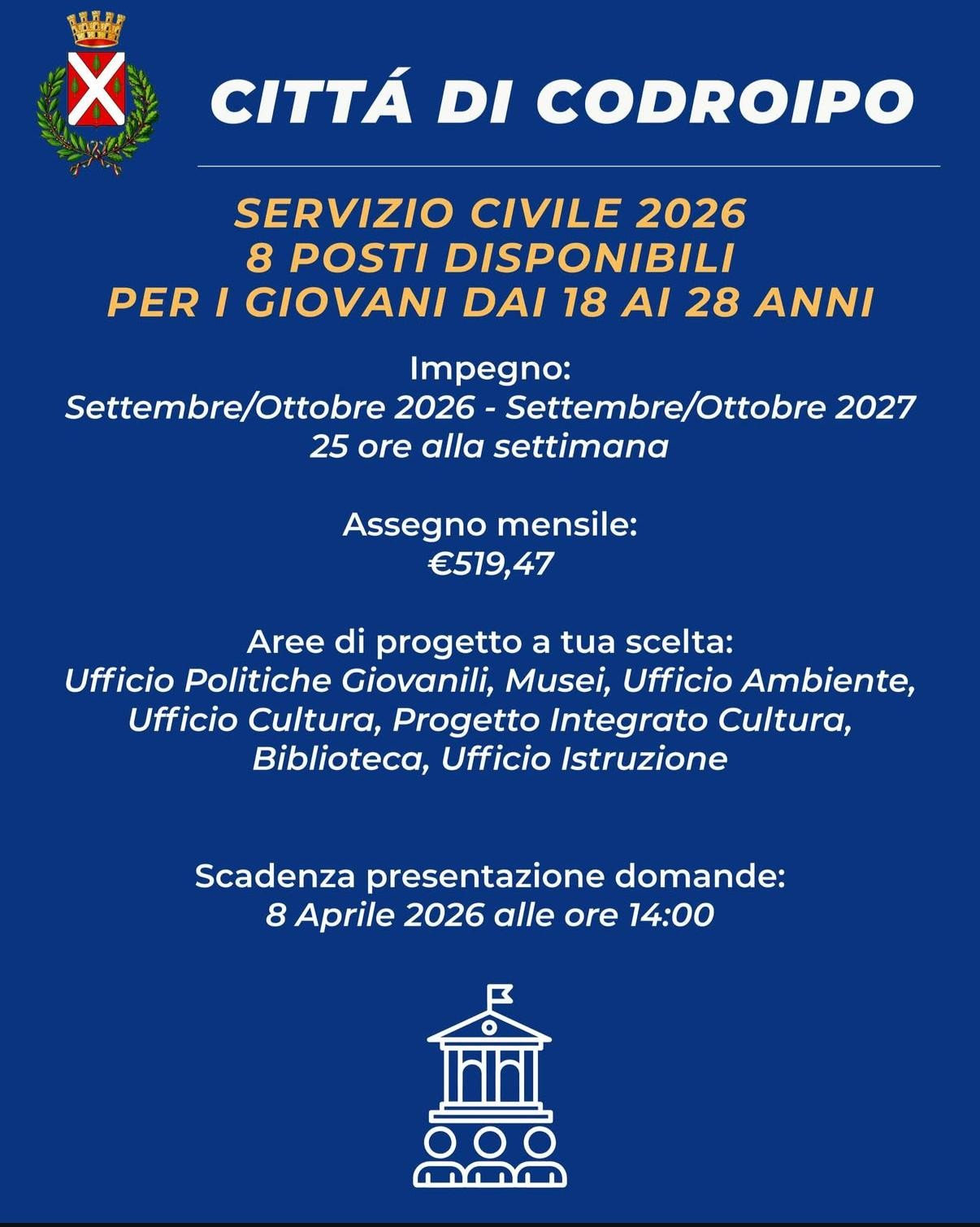 Il Comune di Codroipo mette a disposizione n. 8 posti • Biblioteca civica: 2 volontari • Cultura: 1 volontario • Progetto Integrato Cultura (P.I.C. del Medio Friuli): 1 volontario • Istruzione: n. 1 volontario • Politiche Giovanili: n. 1 volontario • Ambiente (Ufficio Urbanistica): 1 volontari • Musei: 1 volontario