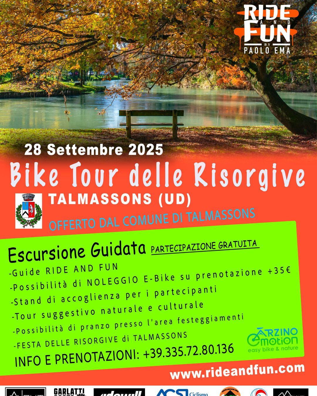 Nell'ambito della Feste delle Risorgive, escursione guidata in bici con e-bike a noleggio. Natura, risate, cultura, pedalate e pranzo organizzati da Ride and Fun in collaborazione con il Comune di Talmassons.