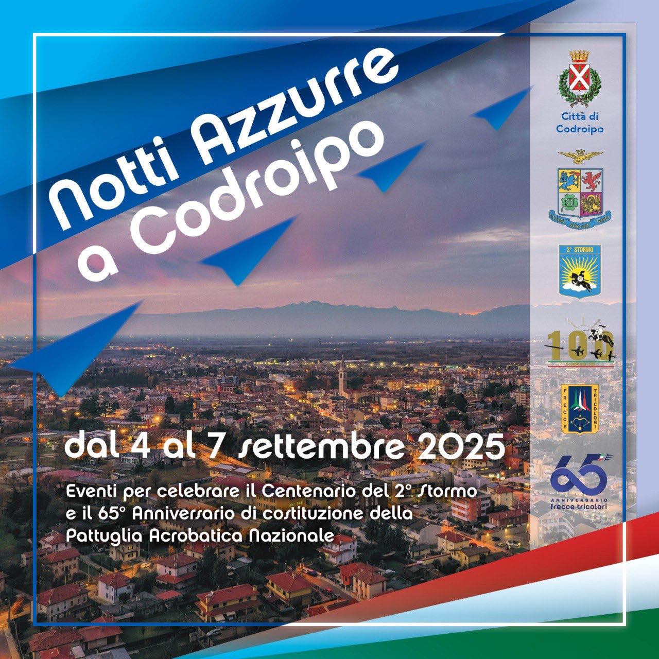 Dal 𝟰 𝗮𝗹 𝟳 𝘀𝗲𝘁𝘁𝗲𝗺𝗯𝗿𝗲 non perdetevi le “Notti Azzurre a Codroipo”: talk, concerti, mostre, proiezioni luminose, spettacoli e iniziative culturali lungo le vie del centro per accompagnare le esibizioni aeree alla base di Rivolto!