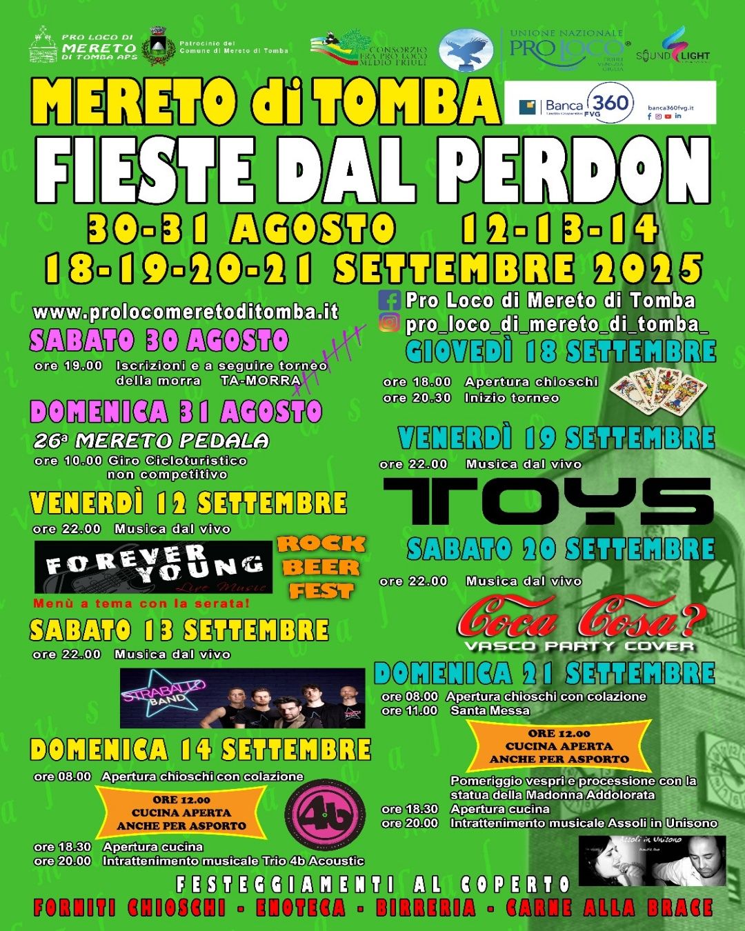 La tradizionale ”Fieste dal Perdon” di Mereto di Tomba è una sagra che vi terrà compagnia per ben tre fine settimana con chioschi, musica live e non solo. Troverete i concerti delle tribute band dei Queen i “Toys” e di Vasco Rossi i “Coca Cosa”, ma anche l’allegria e l’intrattenimento della Straballo Band e i concerti dei “Forever Young”, “4b Acoustic” e “Assoli in Unisono”. Ma in questa festa troverete anche tornei di briscola, pesca di beneficenza, birreria ed enoteca, e la 26ª edizione di “Mereto Pedala” (Domenica 31 Agosto).