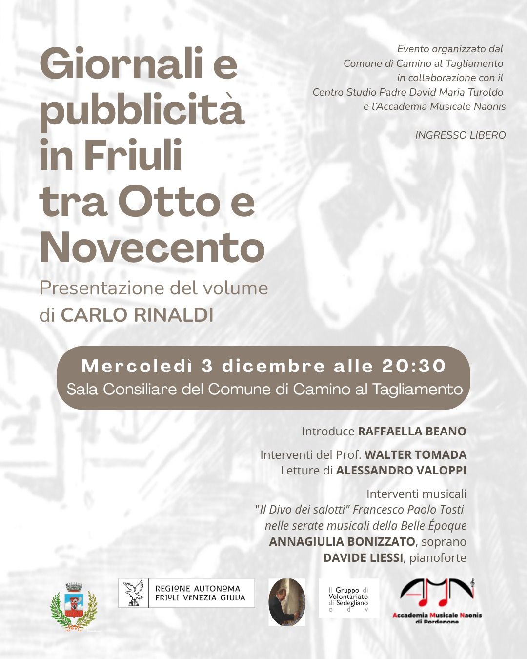 Presentazione del volume "Giornali e pubblicità in Friuli tra Otto e Novecento" di Carlo Rinaldi, edito a cura del Gruppo Volontari di Sedegliano, a cura del Centro Studi Padre David Maria Turoldo di Sedegliano e dell'Accademia Musicale Naonis di Pordenone.