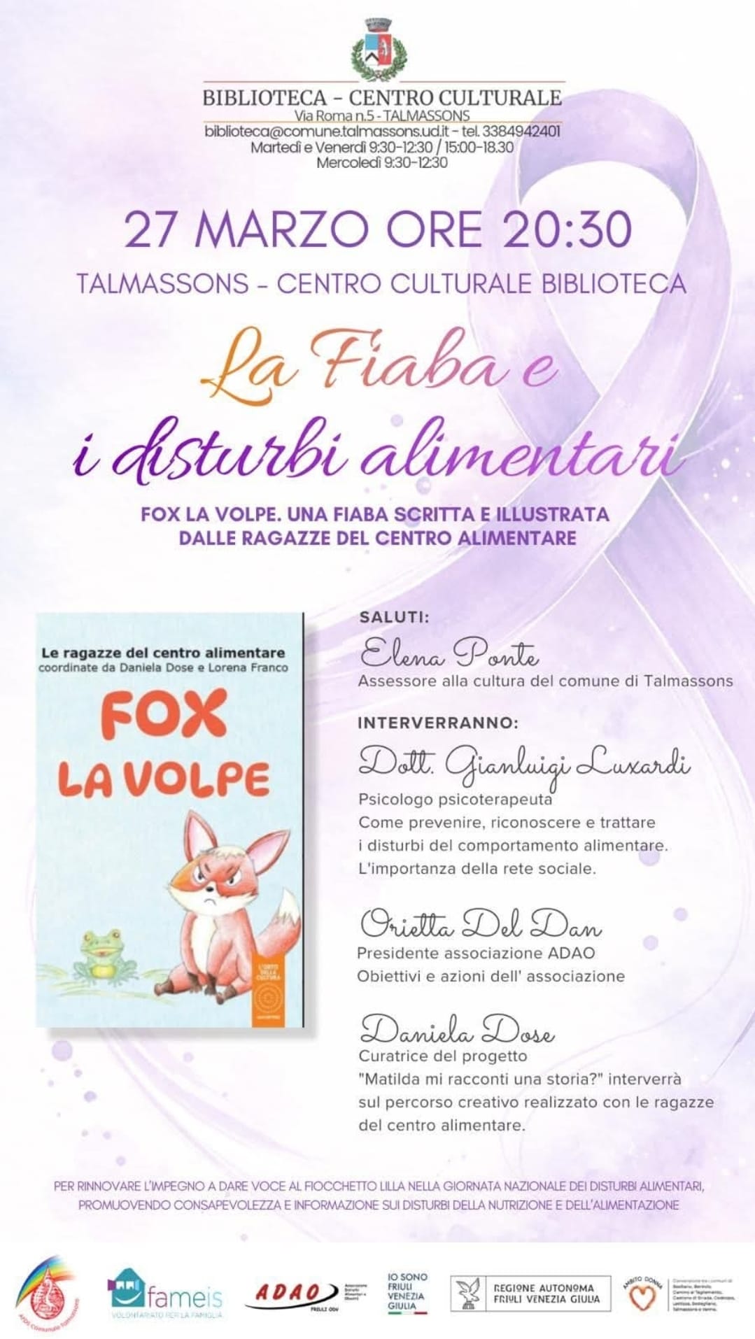 collaborazione con Ambito DONNA, AFDS - Sezione Comunale Talmassons eFameis, vuole porre l'attenzione e sensibilizzare al tema, illuminando di lilla la Biblioteca eSi presenterà il libro FOX LA VOLPE scritto e illustrato dalle ragazze del centro alimentare con l'intervento del Dott.Gianluigi Luxardi che ci parlerà di come prevenire, riconoscere e trattare i disturbi del comportamento alimentare di Pordenone con un particolare focus sull'importanza della rete sociale.