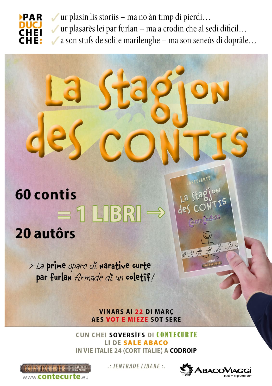 “La stagjon des contis” raccoglie racconti di Jorge Cesaratto, Rudy Citossi, Margherita Cogoi, Olga Cossaro, Marcelo Del Mestre, Serena Fogolini, Massimo Furlani, Pierina Gallina, Silva Ganzitti Savonitto, Leonardo Giavedoni, Eleonora Gregorat, Michele Eritreo Londero, Laurino Giovanni Nardin, Noemi Lilian Salva, Checo Tam, Enrico Tomasi, Renzo Turus, Alessandro Valoppi, Astrid Virili. Si trova su Amazon oppure scrivendo a contecurte@gmail.com