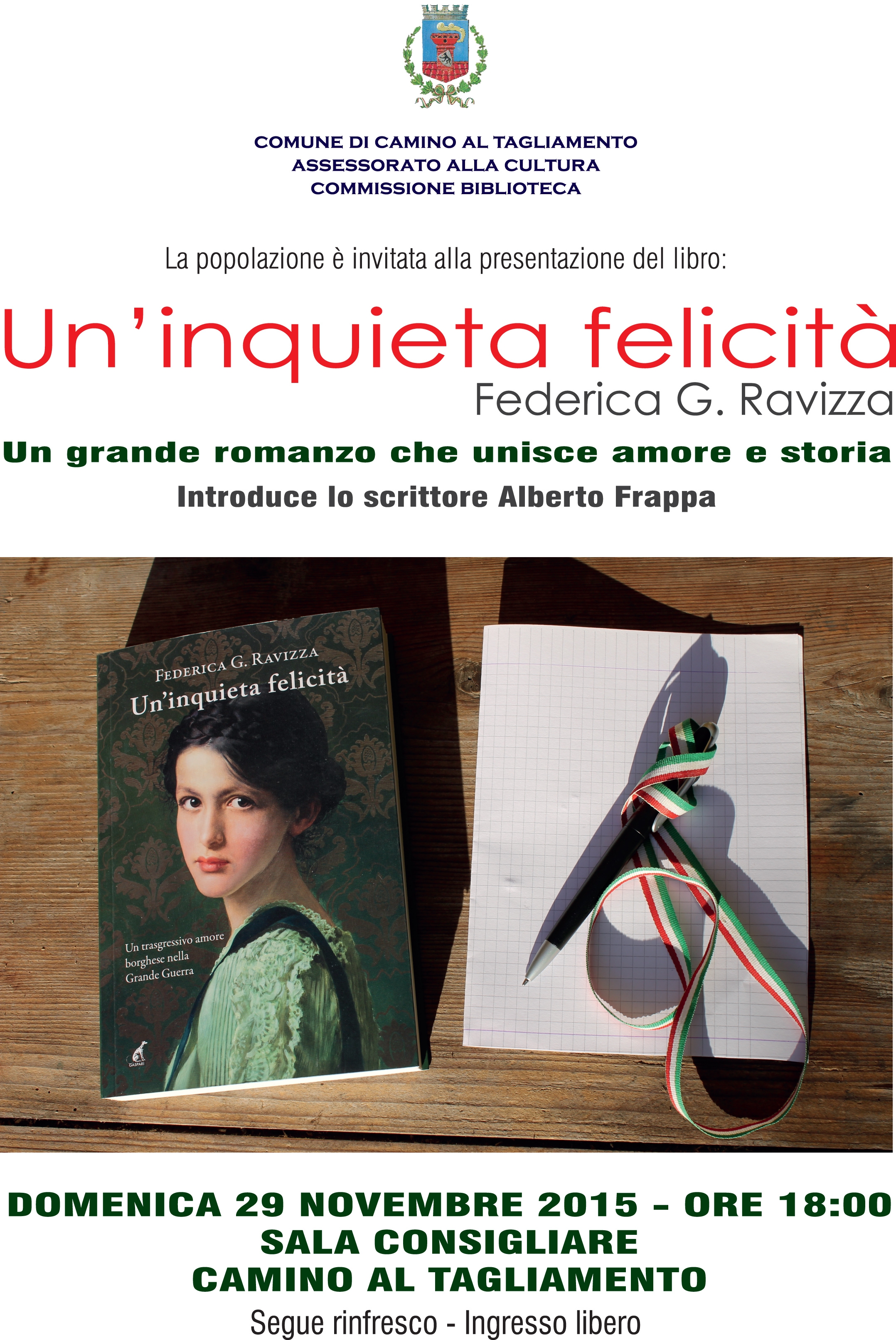 Domenica 29 novembre 2015, alle ore 18.00, presso la Sala Consiliare del Comune di Camino al Tagliamento si terrà la presentazione del libro "Un'inquieta felicità" di Federica G. Ravizza.