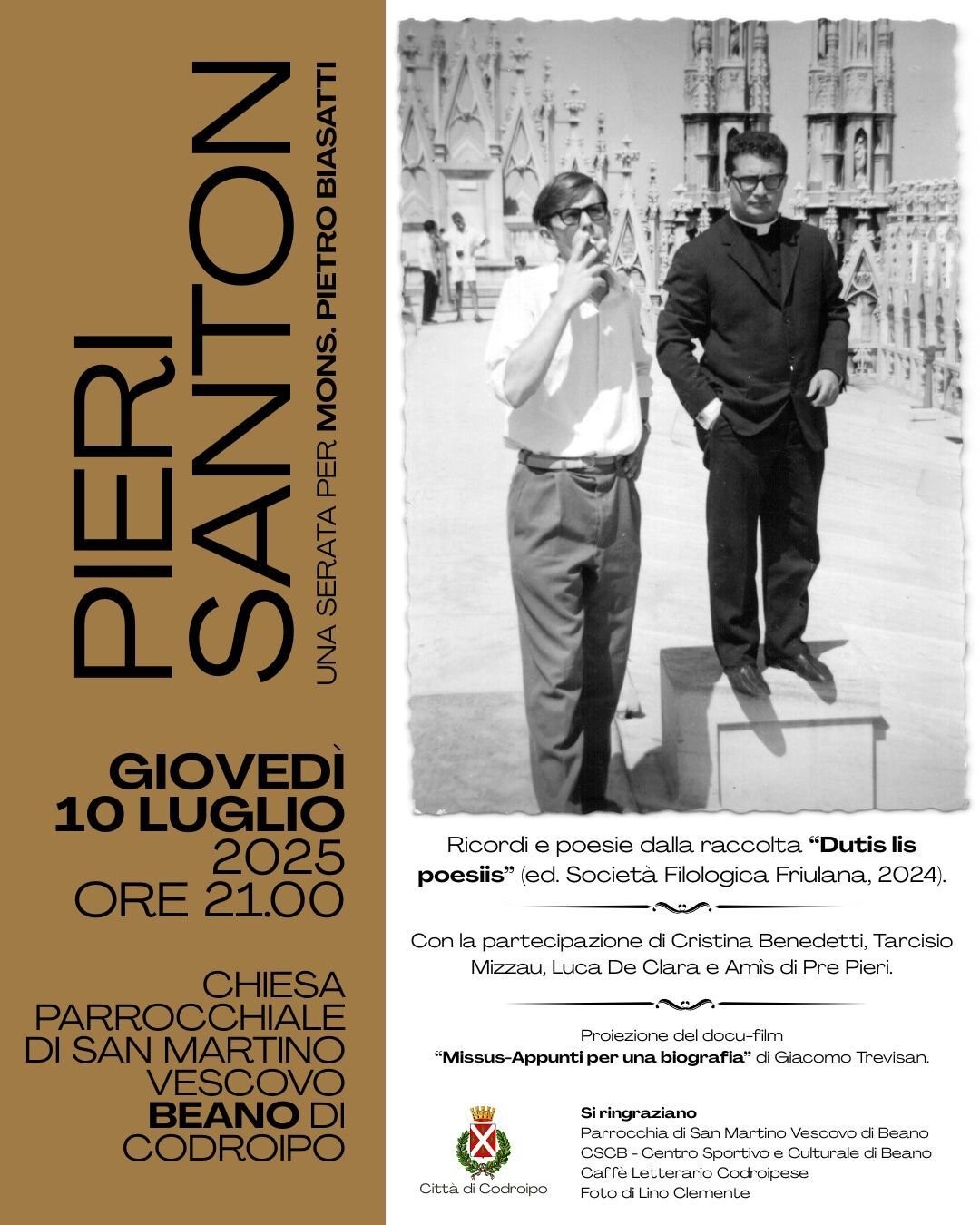 Serata in ricordo di Mons. Pietro Biasatti. Presentazione della raccolta completa “Dutis lis poesiis” con lettura e commento di Luca De Clara, Trarcisio Mizzau e Cristina Benedetti. A seguire verrà proiettato il documentario biografico “Missus. Appunti per una biografia”. In collaborazione con la parrocchia di Beano, il Centro Sportivo e Culturale di Beano, il Gruppo degli Amici di pre Pieri e il Caffè Letterario Codroipese