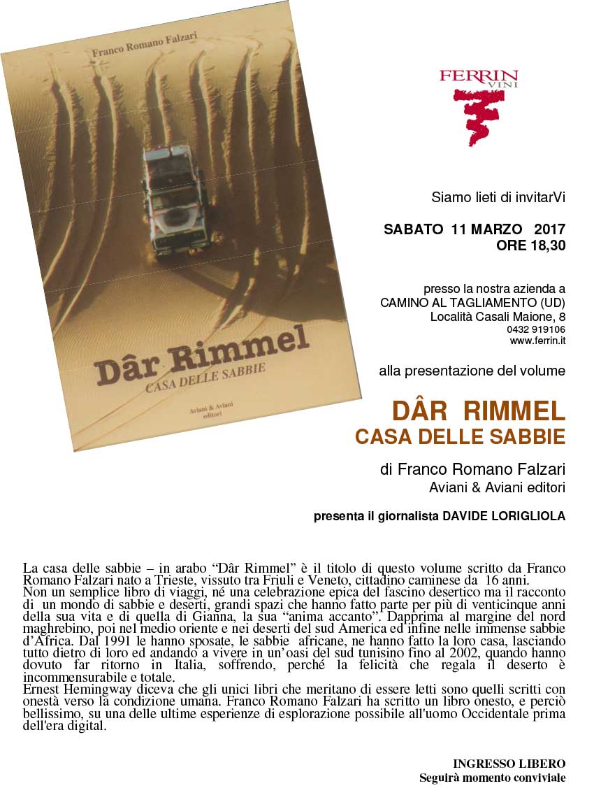 La casa delle sabbie – in arabo “Dâr Rimmel” è il titolo di questo volume scritto da Franco Romano Falzari nato a Trieste, vissuto tra Friuli e Veneto, cittadino caminese da 16 anni.