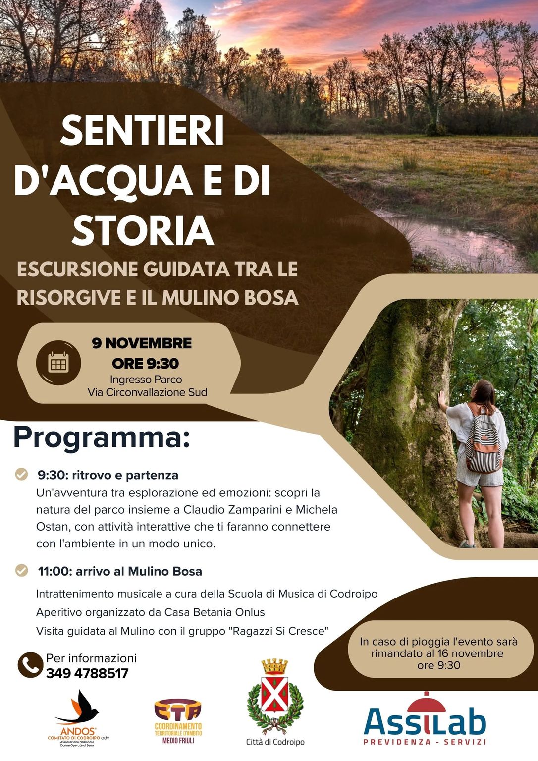 Escursione guidata tra le Risorgive e il Mulino Bosa, mattinata all’insegna della scoperta del territorio, della natura e del piacere di stare insieme. Alle ore 9.30, ritrovo e partenza all’ingresso del Parco delle Risorgive in via Circonvallazione Sud a Codroipo, arrivo al Mulino Bosa per le ore 11 circa, intrattenimento musicale, aperitivo organizzato da Casa Betania Onlus e visita guidata al Mulino con il gruppo “Ragazzi Si Cresce”