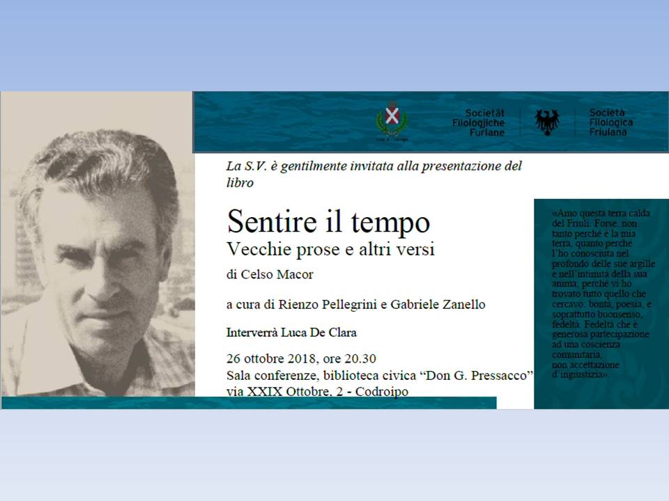 L’opera, che sarà presentata da Luca De Clara, si compone di due volumi: il primo è la Trilogia isontina curata da Rienzo Pellegrini che raccoglie tre opuscoli da tempo irreperibili: Isonzo, finalmente fiume di pace; Torre, fiume del Friuli; L'uomo e la vigna. Sono testi dove la personalità di Macor emerge a tutto tondo con la sua pensosità ritrosa e con i suoi convincimenti radicati, con la sua sensibilità e la sua passione.
