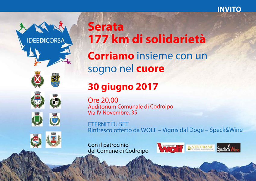 Durante la serata verrà presentato il progetto "Idee di Corsa", i risultati ottenuti nel 2016, gli obiettivi per il 2017 e la squadra di ragazzi che parteciperanno all'evento sportivo "177 km di solidarietà".