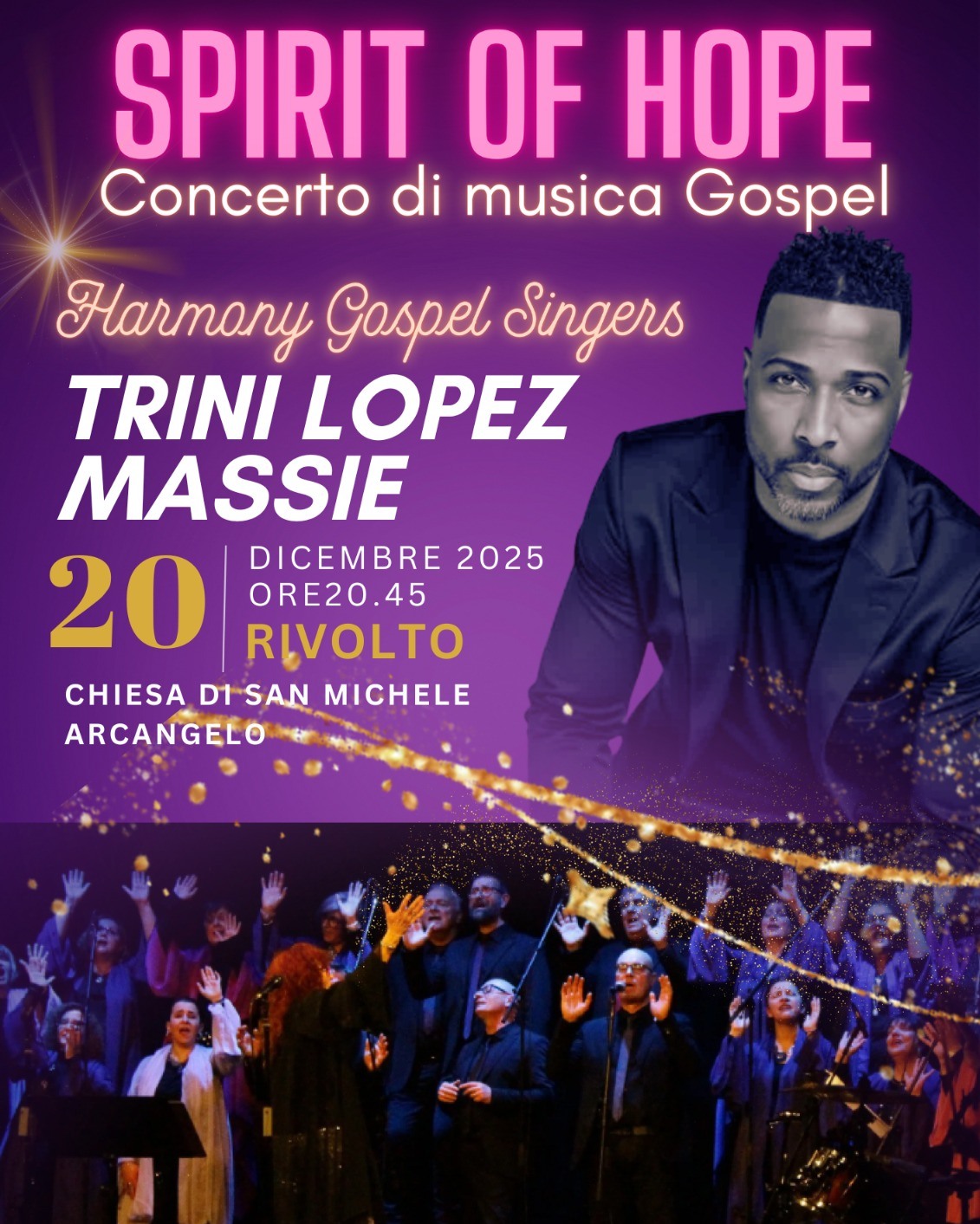 Concerto degli Harmony Gospel Singer con la straordinaria partecipazione di Trini Lopez Massie, compositore, direttore d'orchestra e maestro di coro molto ricercato. Trini Lopez Massie è uno degli astri emergenti della musica gospel degli USA, ha ricevuto numerosi riconoscimenti ed è stato nominato "Ministro Nazionale della Musica" per il Dipartimento Adult Contemporary del Gospel Music Workshop of America. Il concerto è organizzato da AFDS - Sezione di Lonca Passariano Rivolto con la collaborazione Pro Loco Rivolto, Pro Loco Passariano ed il Comune di Codroipo.