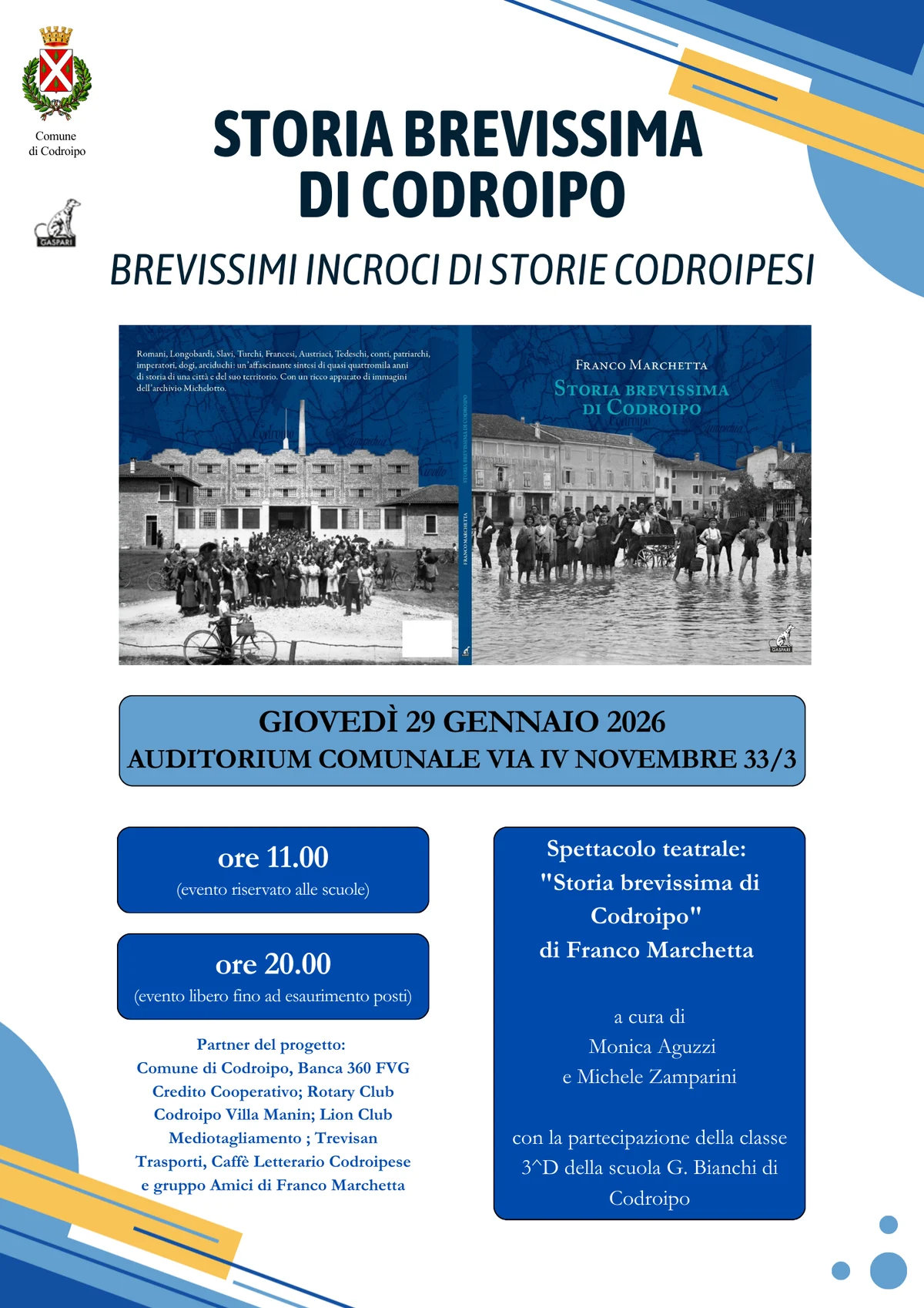 Restituzione del laboratorio teatrale realizzato da un gruppo di studenti delle classi terze della Scuola secondaria di primo grado “G. Bianchi” di Codroipo, a cura di Monica Aguzzi e Michele Zamparini a partire da alcune pagine del volume Storia brevissima di Codroipo di Franco Marchetta