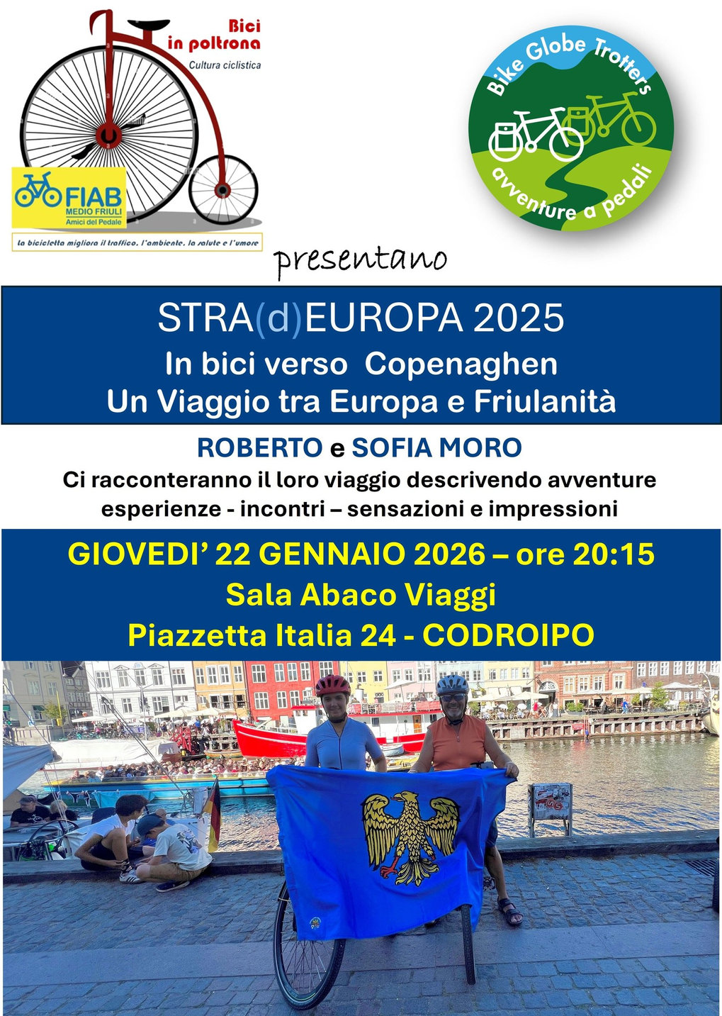 Apertura del 24° anno sociale FIAB Medio Friuli – Amici del pedale con “Bici in poltrona”: Roberto e Sofia Moro racconteranno il loro viaggio in bicicletta che li ha condotti da Bertiolo a Copenaghen nell’estate del 2025