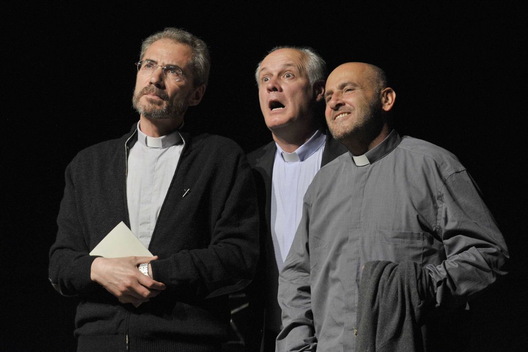 Ma ciò che rende i tre preti ancor più partecipi al lieto evento è il fatto di non sapere chi sia il padre del bambino che sta per nascere. Ed è per questo che, con lievità, assumono su di sé il ruolo di padri teneri, preoccupati, amorevoli. Sentimenti che li portano a fare i conti con le maldicenze di qualche parrocchiano, i pregiudizi, ma soprattutto con i loro dubbi, con il loro stesso bisogno di paternità. In attesa della chiamata il tempo si sospende: sarà una lunga notte. Natale è alle porte. Il luogo in cui si svolge l’azione diventa spazio dell’anima: l’ospedale si fa deserto, labirinto, cielo stellato. E giungono messaggi misteriosi che invitano i tre a mettersi in cammino.