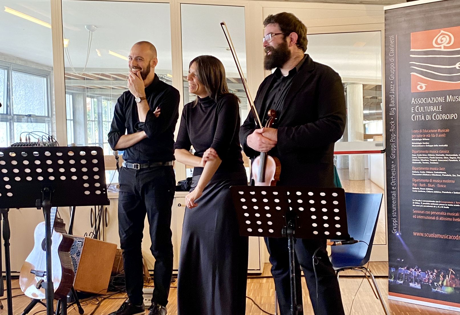 Ieri alle 11 in Biblioteca a Codroipo si è tenuto il terzo dei concerti della 33ma edizione de “I concerti della domenica” organizzata dall’Associazione Musicale e Culturale “Citta di Codroipo” con la collaborazione del Comune di Codroipo e la direzione artistica del M° Giorgio Cozzutti. Protagonisti Marco Bianchi alla chitarra, Giovanni Di Lena al violino e Sara Della Mora soprano ovvero il Trio Amedyez. Un concerto ricco di sfumature, musicalità e poesia, provenienti da culture diverse anche molto lontane tra loro, mediato e impreziosito dalla sensibilità musicale e dalle doti tecniche dei tre musicisti. Un’occasione concreta di percepire il confine e le differenze come una ricchezza nella quale tuffarsi, senza paura, alla scoperta dell’altro e dei suoi sentimenti, in fondo, non molto diversi dai propri. Un trio friulano che grazie alla propria cultura di confine ha saputo regalare al folto e partecipe pubblico oltre un’ora di musica di altissimo livello.