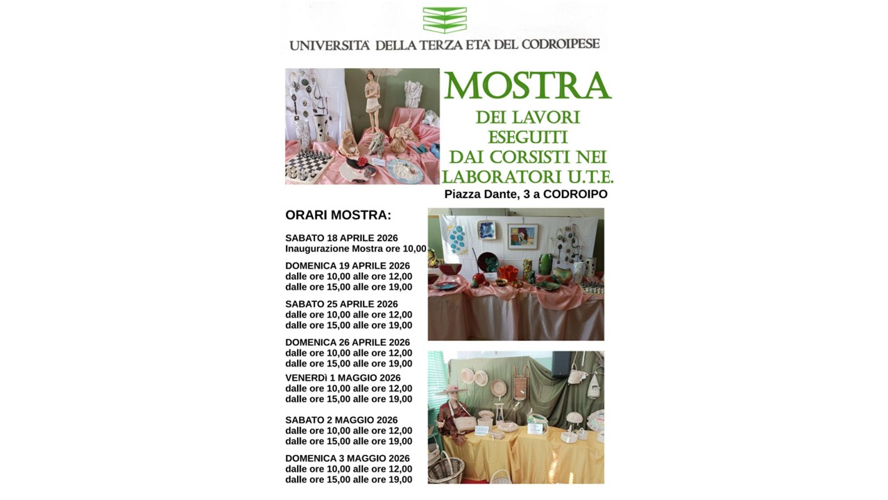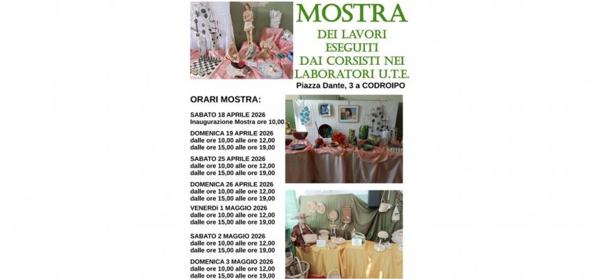 Anche quest'anno è tornato l'appuntamento con la mostra dei lavori realizzati dalle sezioni dell'Università della Terza Età del Codroipese esposti nell'ex scuola elementare in Piazza Dante 3, a Codroipo, per tre fine settimana consecutivi cominciando dall'inaugurazione di sabato scorso 18 aprile.