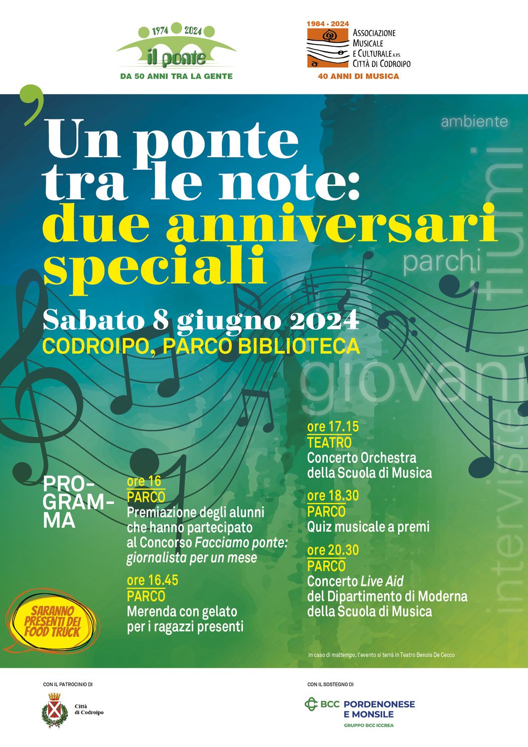 Grande Festa sabato 8 giugno dalle 16:00 nel Parco della Biblioteca di Codroipo per festeggiare il 50° dalla prima pubblicazione de "il ponte" e il 40° anno di attività per la Scuola di Musica.Durante la manifestazione verranno premiati i partecipanti al concorso "Facciamo ponte: Giornalista per un mese" a cui le Vs. scuole hanno aderito, ovvero non meno di 300 alunni!Seguiranno momenti di divertimento, musica e convivialità con la merenda a base di gelato, l'Orchestra della Scuola di musica, il Quizzone musicale a premi e per finire il Concerto Live Aid della Band del Dipartimento di Moderna della Scuola di musica.