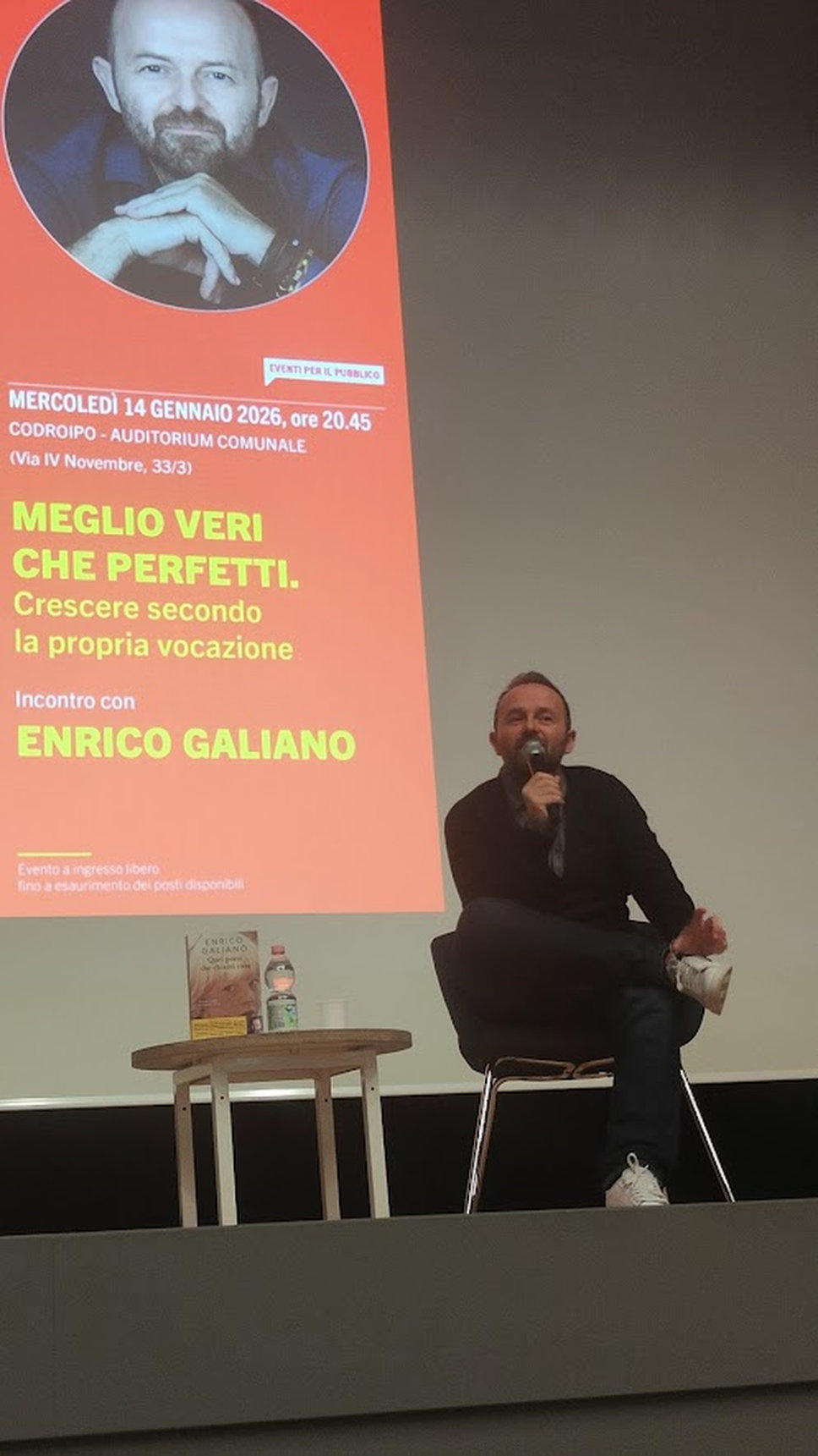 “Meglio veri che perfetti” è una dichiarazione di intenti, quasi un manifesto educativo che Enrico Galiano, scrittore e insegnante friulano tra i più seguiti dai giovani, porta avanti in tutta Italia. Lo ha fatto anche all’auditorium di Codroipo, ospite della rassegna “Che storie”, con un incontro aperto a tutti che ha saputo coinvolgere e interrogare il pubblico.