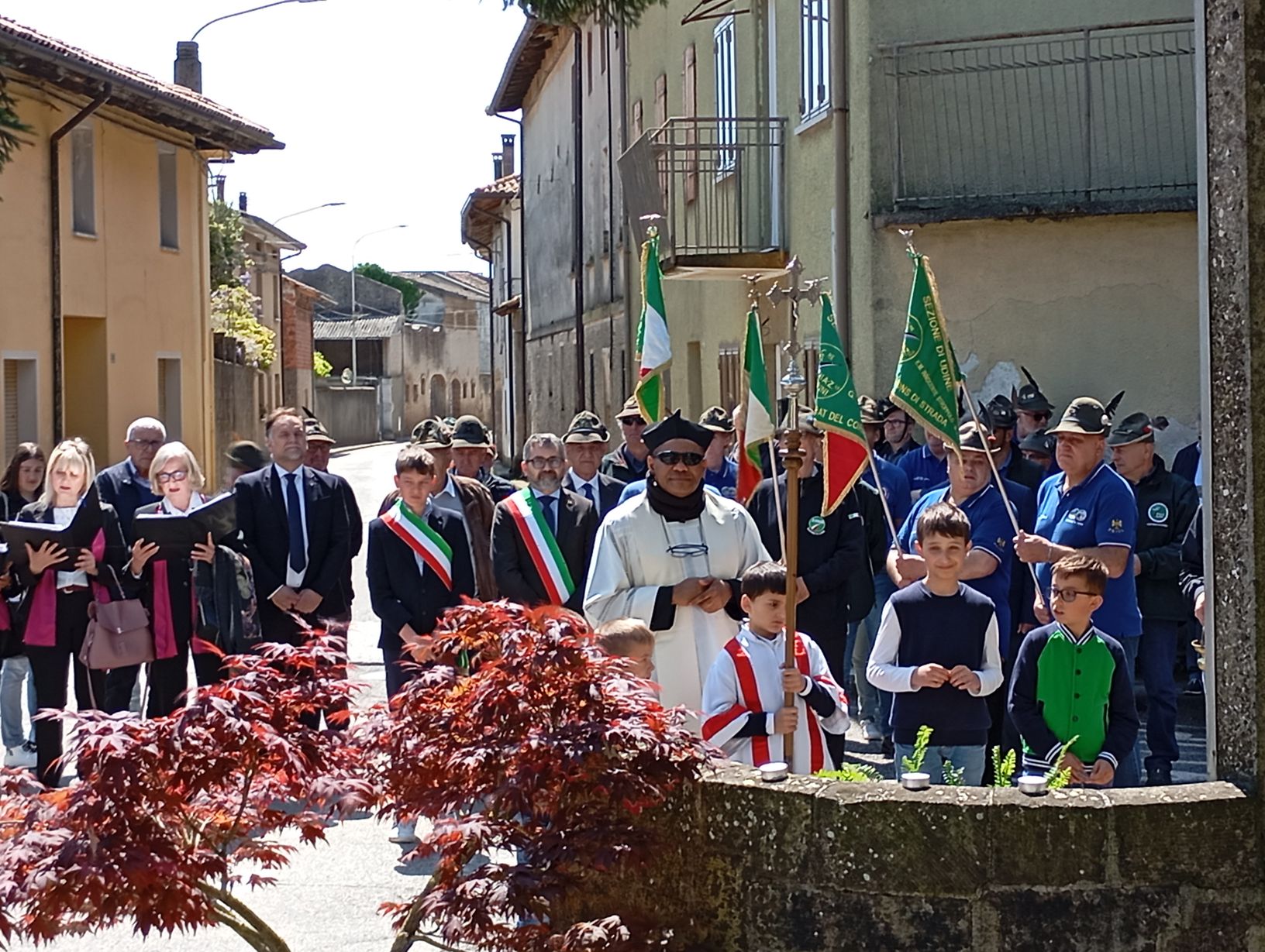 Accanto al sindaco Fabrizio Pitton, il collega Ivan Petrucco sindaco di Castions di Strada paese natale di don Enrico, il vicario parrocchiale don Ugonna, la presidente di Flumignan in Fieste Veronica Versolato.