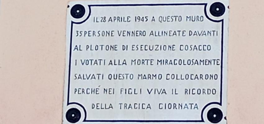 La pubblicazione narra dei fatti storici avvenuti il 28 aprile 1945, frutto di testimonianze e di documenti come annota l’autore Roberto Tirelli. Ebbene in quel giorno “35 persone vennero allineate davanti al plotone di esecuzione cosacco, sono le due del pomeriggio e tra i 35 ci sono anche i gli sposi della mattina” scrisse nel suo diario il parroco don Enrico D’Ambrosio. In quel giorno di primavera, alcune ore prima, si era celebrato il matrimonio di Vittorio e Solidea: in poche ore si passa dalla festa, festa di tutto un paese, all’angoscia, al terrore di una certa esecuzione.
