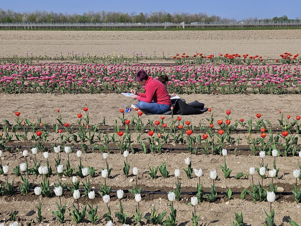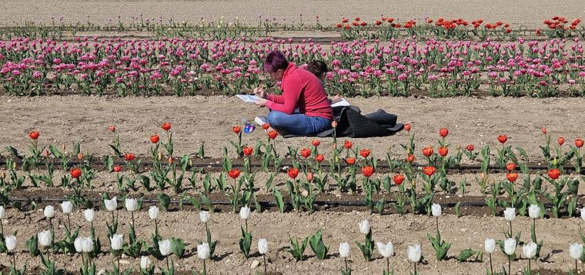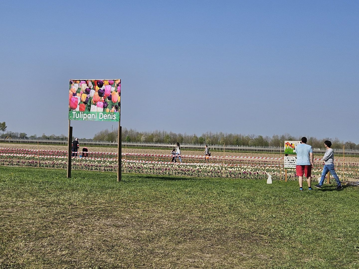 Un tappeto colorato di tulipani ha trasformato un campo di Roveredo di Varmo in un suggestivo angolo d’Olanda, dando vita al sogno di Denis Comisso, realizzato insieme alla moglie Roberta Presti e al figlio Francesco. Il progetto, che unisce passione per la natura e spirito imprenditoriale, è stato ufficialmente inaugurato domenica 30 marzo alla presenza del presidente del Consiglio regionale del Friuli Venezia Giulia, Mauro Bordin, e del sindaco di Varmo, Franco Prampero, e ha visto in questi giorni l'affluenza di tanti interessati e curiosi. Questa mattina erano presenti diversi artisti per un'estemporanea di pittura. L’idea del campo di tulipani è nata dall’intuizione di Denis, già attivo nel settore del verde con la sua azienda specializzata in potature, impianti irrigui e progettazione di giardini. Fondamentale il supporto dei due olandesi Adrian Smets e Sjaak Verweij, residenti a Camino al Tagliamento, che hanno curato l’importazione dei bulbi dall’Olanda e collaborato alla loro messa a dimora a dicembre. I fiori, coltivati su una superficie di circa 5.000 metri quadri, non sono specie autoctone ma si sono perfettamente adattati all’ambiente friulano. Ce ne sono di tutti i colori: fucsia, bianchi, arancioni, rossi, screziati, bicolor ... Insomma, l’obiettivo è stato raggiunto: far crescere i tulipani per poi rivenderli sia come fiori ornamentali che come piante da trapiantare nei giardini a prezzi modici, rispettivamente un euro e un euro e cinquanta l'uno.