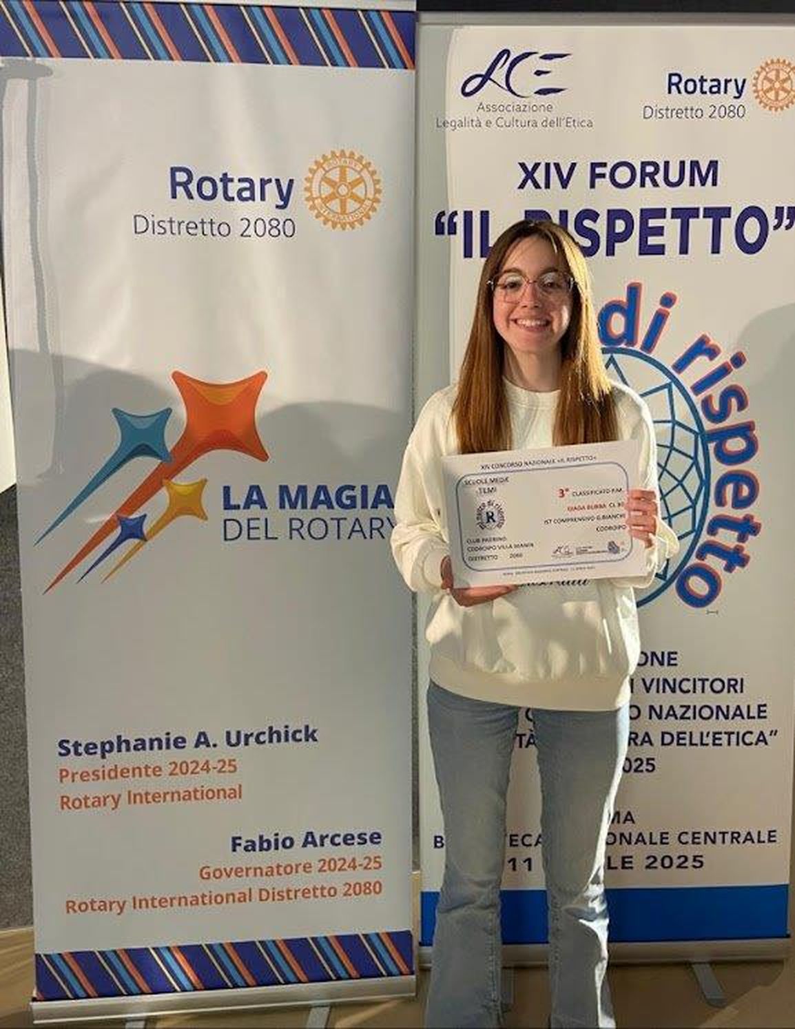 Ha solo tredici anni, ma ha già qualcosa da insegnare con un tema coraggioso, conquista Roma e porta in alto il Friuli. Giada Burba, studentessa della 3ª classe della scuola secondaria “G. Bianchi” di Codroipo, ha conquistato il terzo posto nel concorso nazionale “Legalità e Cultura dell’Etica 2025”, promosso dal Rotary Club Italia. Tra oltre mille partecipanti provenienti da tutta Italia, la sua voce si è distinta per maturità e profondità, portandola sul podio a Roma, lo scorso 11 aprile, nella prestigiosa Biblioteca Nazionale.