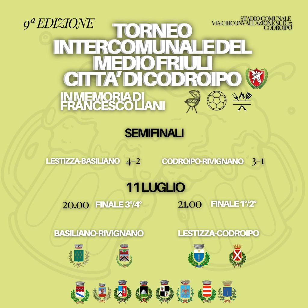 Battendo in semifinale rispettivamente il Basiliano 4 a 2 e il Rivignano 3 a 1, ieri sera Lestizza e Codroipo si sono aggiudicate un posto per la finale del 9° Torneo intercomunale del Medio Friuli, che si terrà domani alle 21:00 allo Stadio di Codroipo in via Circonvallazione Sud 25. Alle 20:00 si potrà invece assistere alla finale per il 3° e 4° posto tra Basiliano e Rivignano.