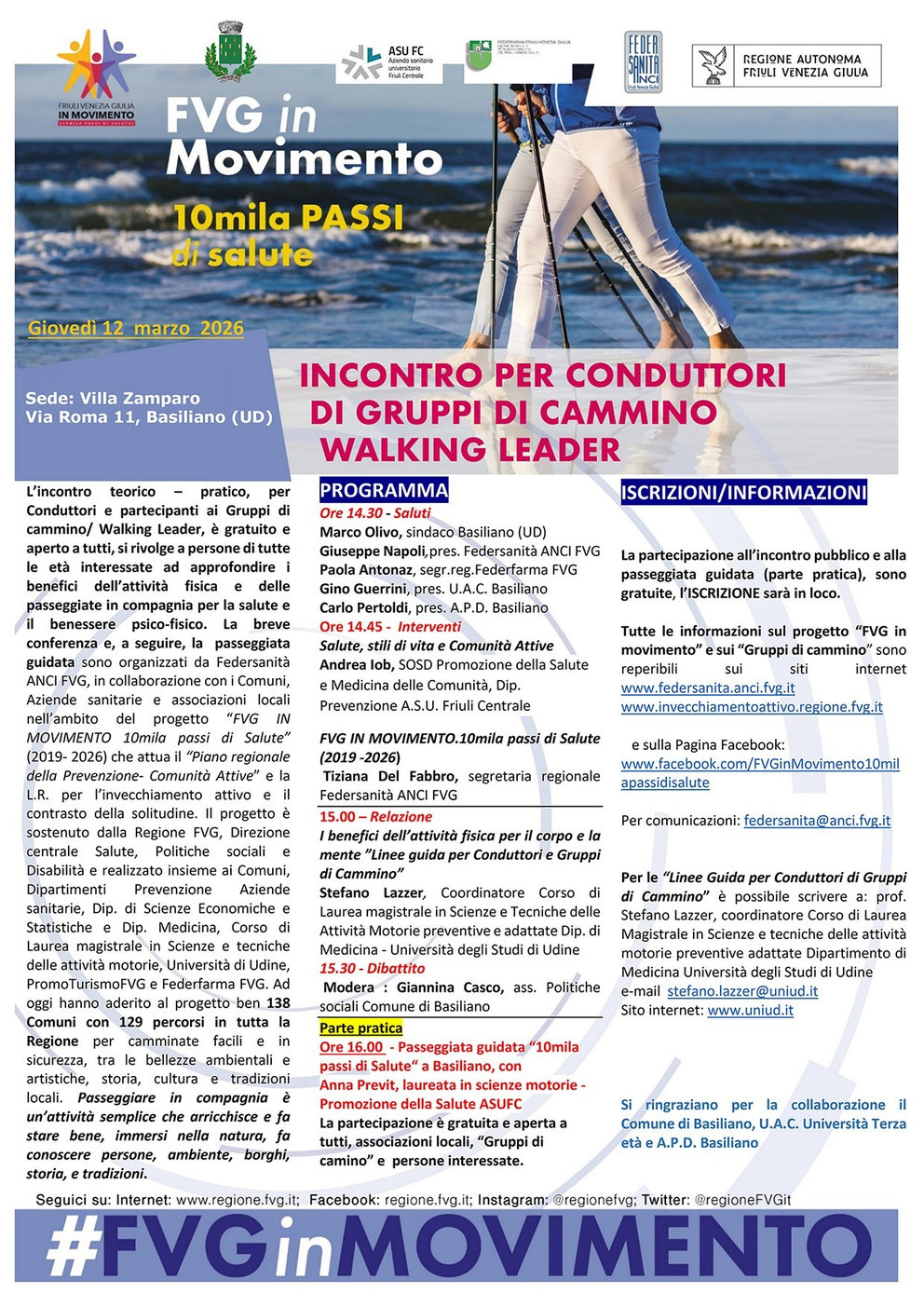 Incontro pubblico. teorico-pratico, per GRUPPI DI CAMMINO, con presentazione in anteprima e del manuale aggiornato per “Conduttori di Gruppi di Cammino/ Walking Leader” . Alle ore 16 circa inizierà la passeggiata guidata da una laureata in Scienze Motorie.