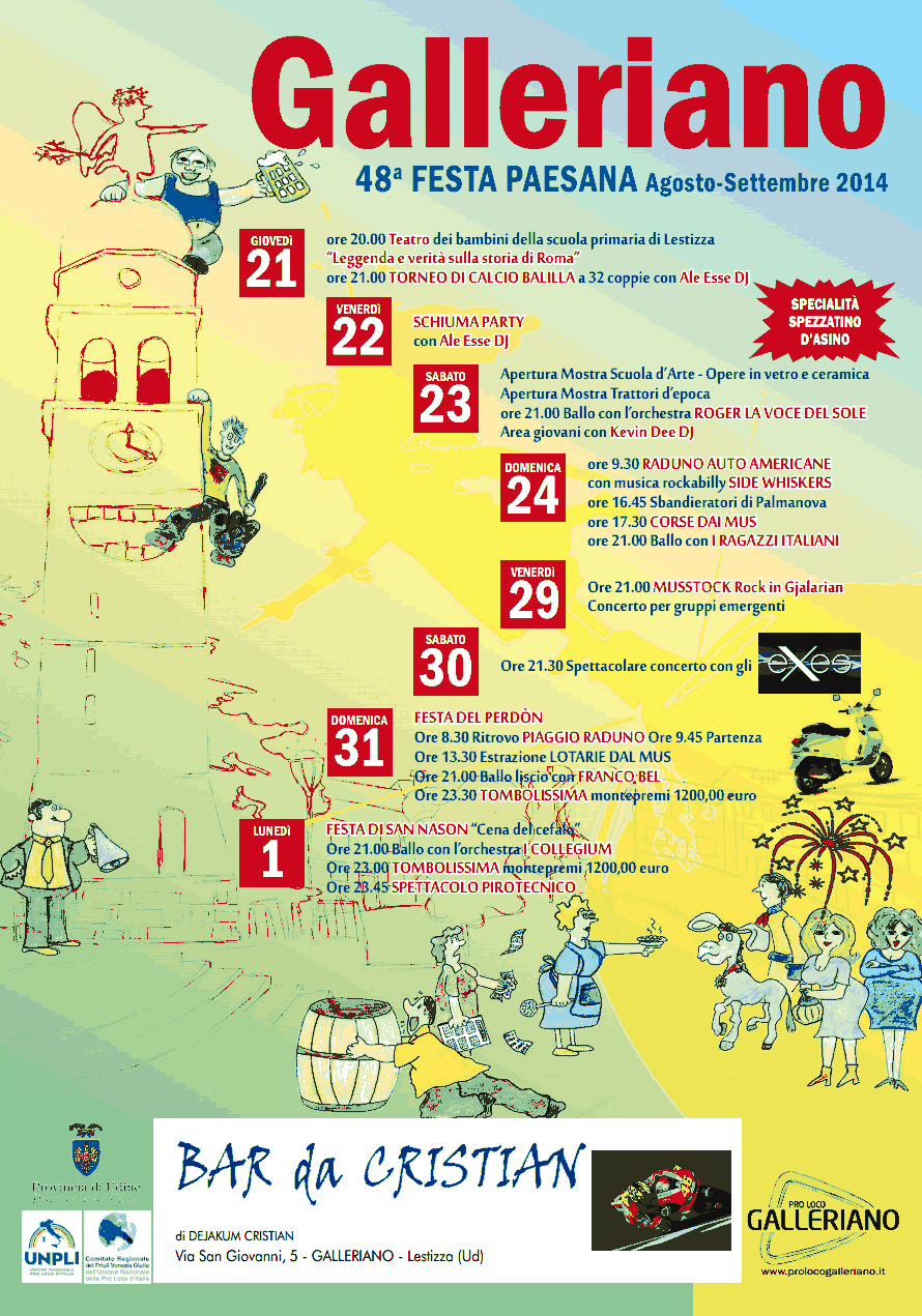 giovedì 21 agosto ore 20.00 Teatro dei bambini della Scuola Primaria di Lestizza "Leggenda e verità sulla storia di Roma" ore 21.00 Torneo di Calcio Balilla a 32 coppie con Ale Esse DJ
