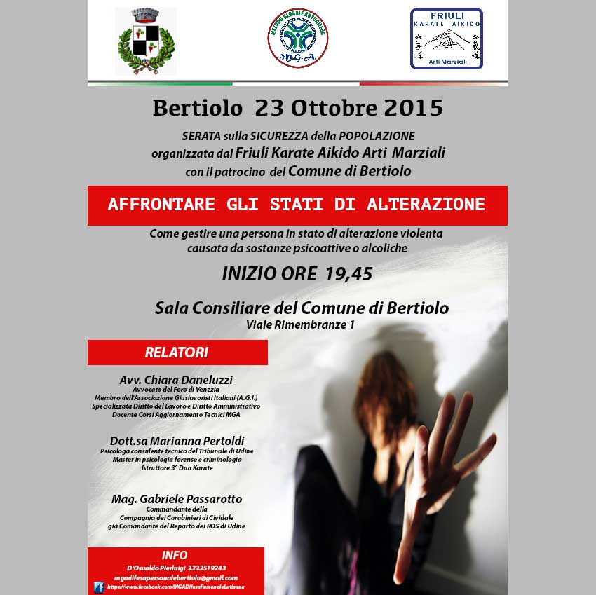 Quest’anno il Friuli Karate Aikido Arti Marziali A.S.D. raggiunge l’invidiabile traguardo dei 35 anni di attività. Per festeggiare questo anniversario, fra i vari eventi, venerdì 23 ottobre presso la Sala Consigliare del Comune Bertiolo alle 19.45 organizza una serata, aperta a tutti, dal titolo “Affrontare gli stati di alterazione” con il patrocinio dell’Amministrazione Comunale sempre sensibile alle tematiche della sicurezza dei Cittadini.