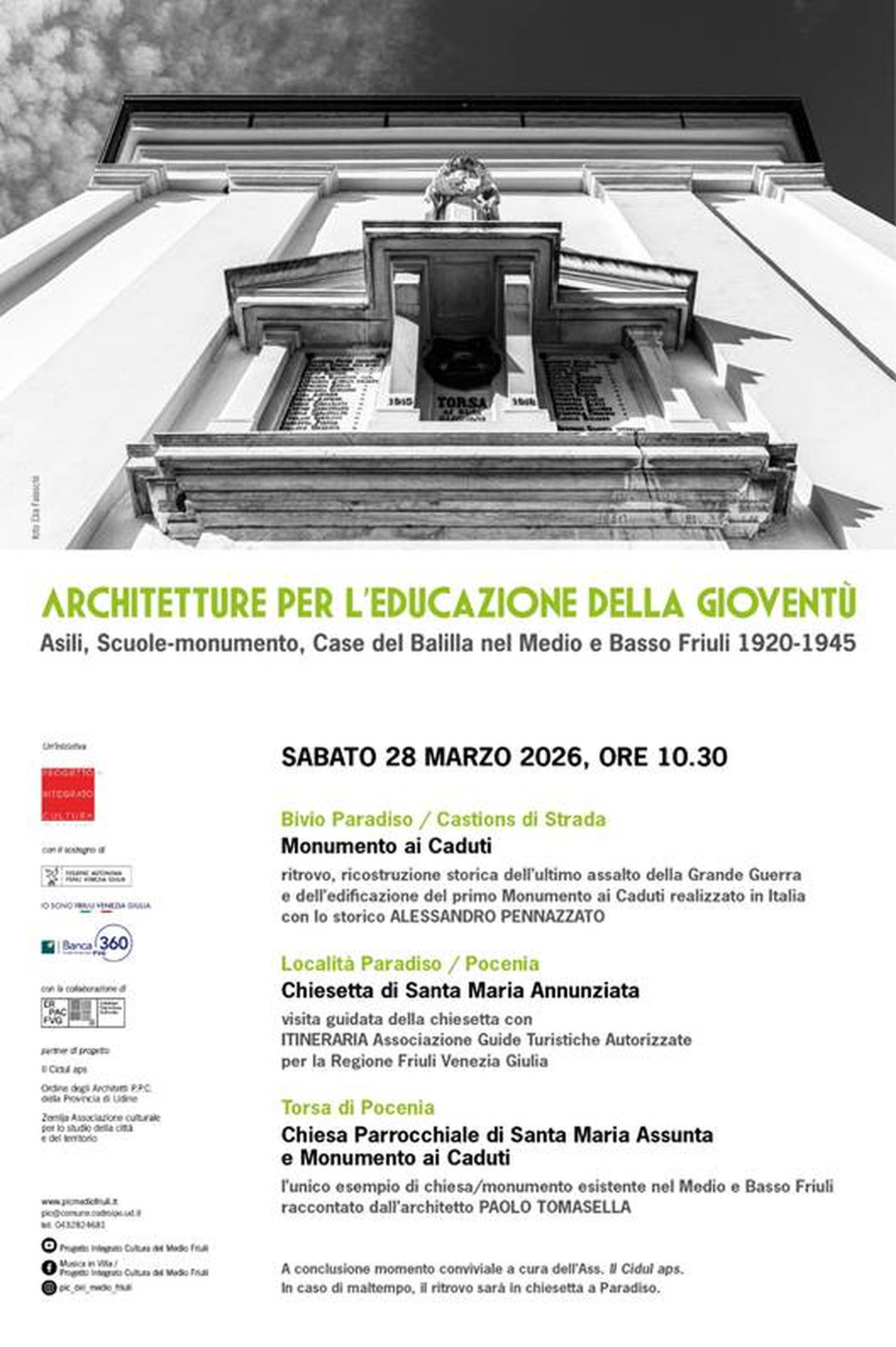 Un percorso gratuito tra storia, architettura e memoria, per osservare con occhi diversi alcuni luoghi significativi del Medio e Basso Friuli. Il ritrovo sarà presso il Monumento ai Caduti di Bivio Paradiso / Castions di Strada, con l’intervento dello storico Alessandro Pennazzato; il percorso proseguirà poi alla Chiesetta di Santa Maria Annunziata in località Paradiso / Pocenia con visita guidata a cura di ITINERARIA, e si concluderà a Torsa di Pocenia, presso la Chiesa Parrocchiale di Santa Maria Assunta e Monumento ai Caduti, presentata dall’architetto Paolo Tomasella. A seguire, momento conviviale a cura dell’Ass. Il Cidul aps. Ingresso libero In caso di maltempo, ritrovo in chiesetta a Paradiso.