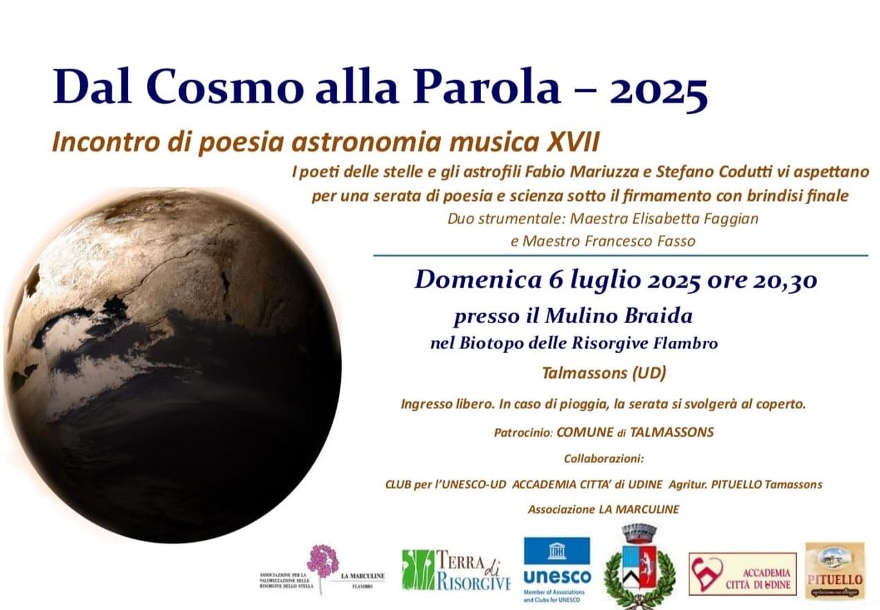 È questo lo spirito della manifestazione "Dal Cosmo Alla Parola", giunto alla 17^edizione che si svolgerà domenica 6 luglio, a partire dalle 20,30, al Mulino Braida di Flambro di Talmassons, nel suggestivo biotopo delle risorgive, ambito naturalistico di grande pregio.