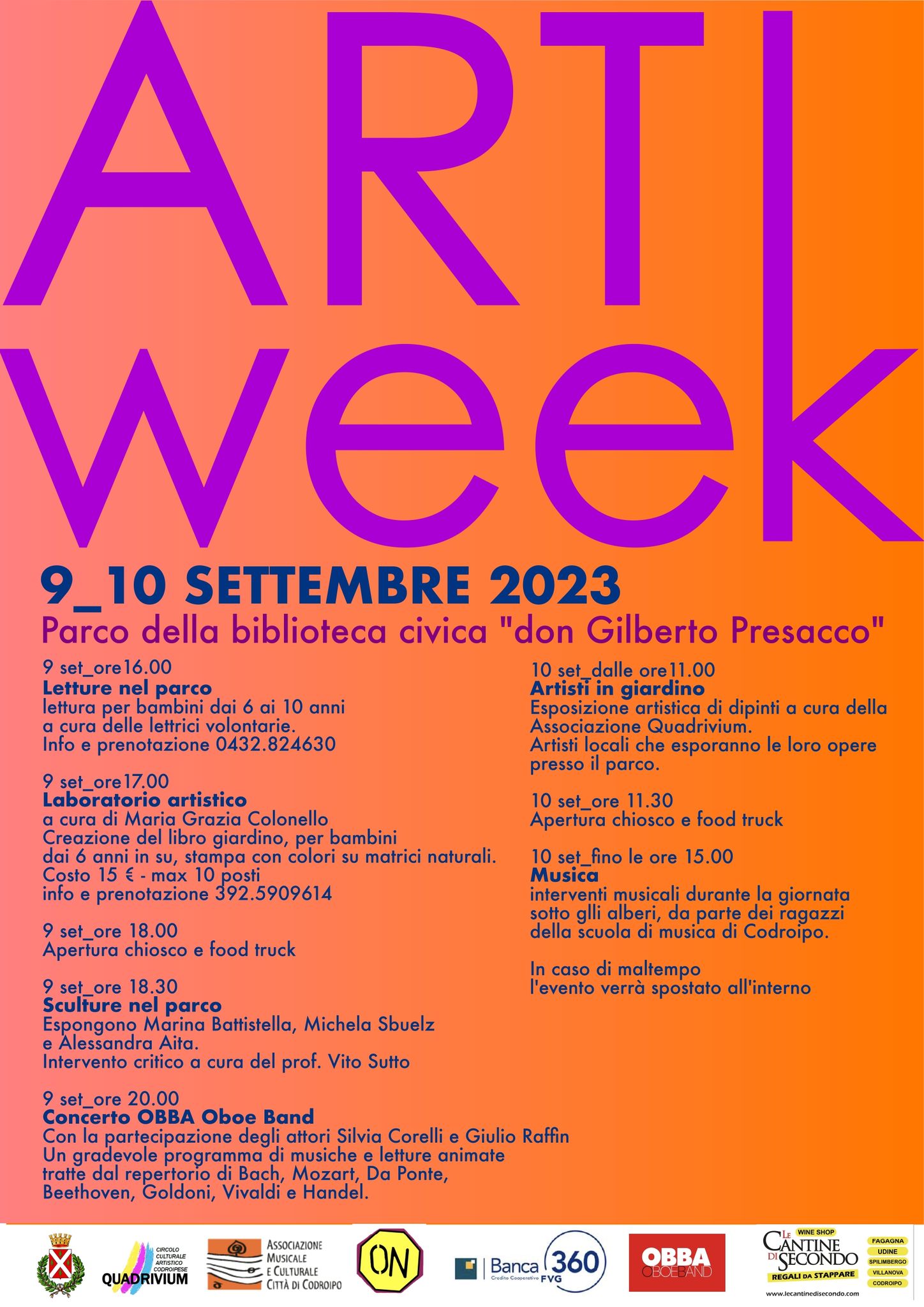 Letture per bambini, serata musicale ed esposizione di laboratori artistici a cura di Associazione Quadrivium, Ottagono e Scuola di Musica “Città di Codroipo”. Gli eventi sono gratuiti, per tutti i dettagli clicca qui e controlla la pagina Facebook del Sistema Bibliotecario del Medio Friuli. Questo evento è inserito nel programma “Estate Codroipese”