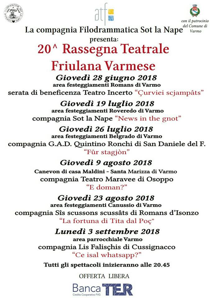 È arrivata l’estate e, come di consueto, a Varmo è tempo di teatro all’aperto con la 20° Rassegna Teatrale Friulana Varmese a cura della compagnia filodrammatica Sot la Nape, che per quest’anno ha organizzato un cartellone di ben 6 serate, grazie al sostegno della Banca Ter, al patrocinio del Comune di Varmo e dell’Associazione Teatrale Friulana e alla collaborazione delle varie pro loco.
