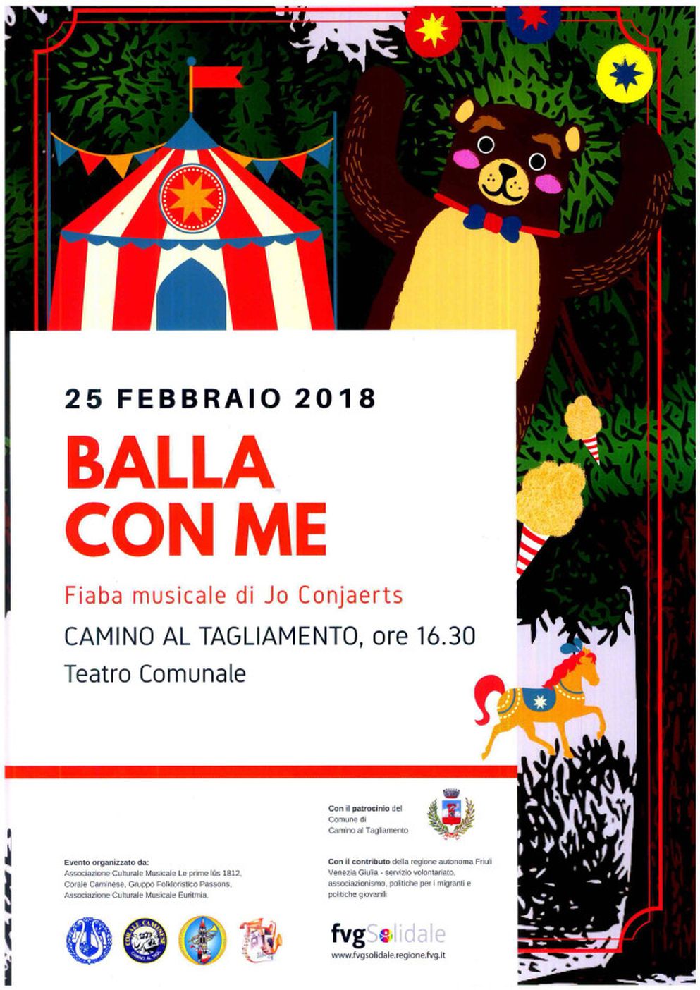 Il grande impegno di una cordata composta dall'Associazione Culturale Musicale "Filarmonica la prime lûs 1812" di Bertiolo, dalla Corale Caminese, di Camino al Tagliamento, dal Gruppo Folkoristico di Passons e dall’Associazione Culturale Musicale "Euritmia" di Povoletto ha permesso l'allestimento di uno spettacolo di teatro musicale per bambini, "Balla con me" (titolo originale "Tanz mit"), che verrà presentato anche domenica 25 febbraio alle 16.30 al teatro comunale di Camino al Tagliamento.