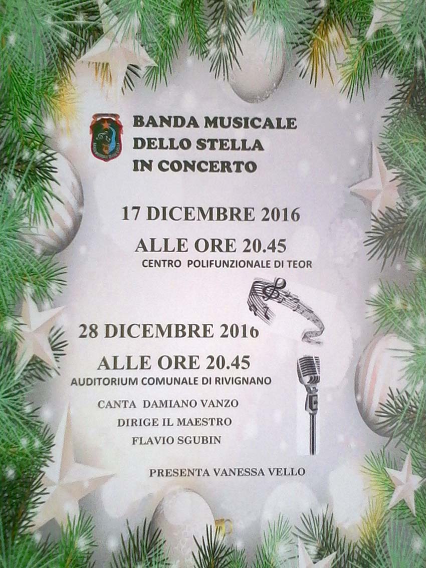 La "Banda Musicale dello Stella" è molto lieta di invitarvi ai concerti che si terranno: il 17 dicembre 2016 alle ore 20.45 presso il polifunzionale di Teor.