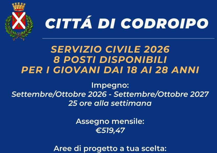 Il Comune di Codroipo mette a disposizione n. 8 posti • Biblioteca civica: 2 volontari • Cultura: 1 volontario • Progetto Integrato Cultura (P.I.C. del Medio Friuli): 1 volontario • Istruzione: n. 1 volontario • Politiche Giovanili: n. 1 volontario • Ambiente (Ufficio Urbanistica): 1 volontari • Musei: 1 volontario