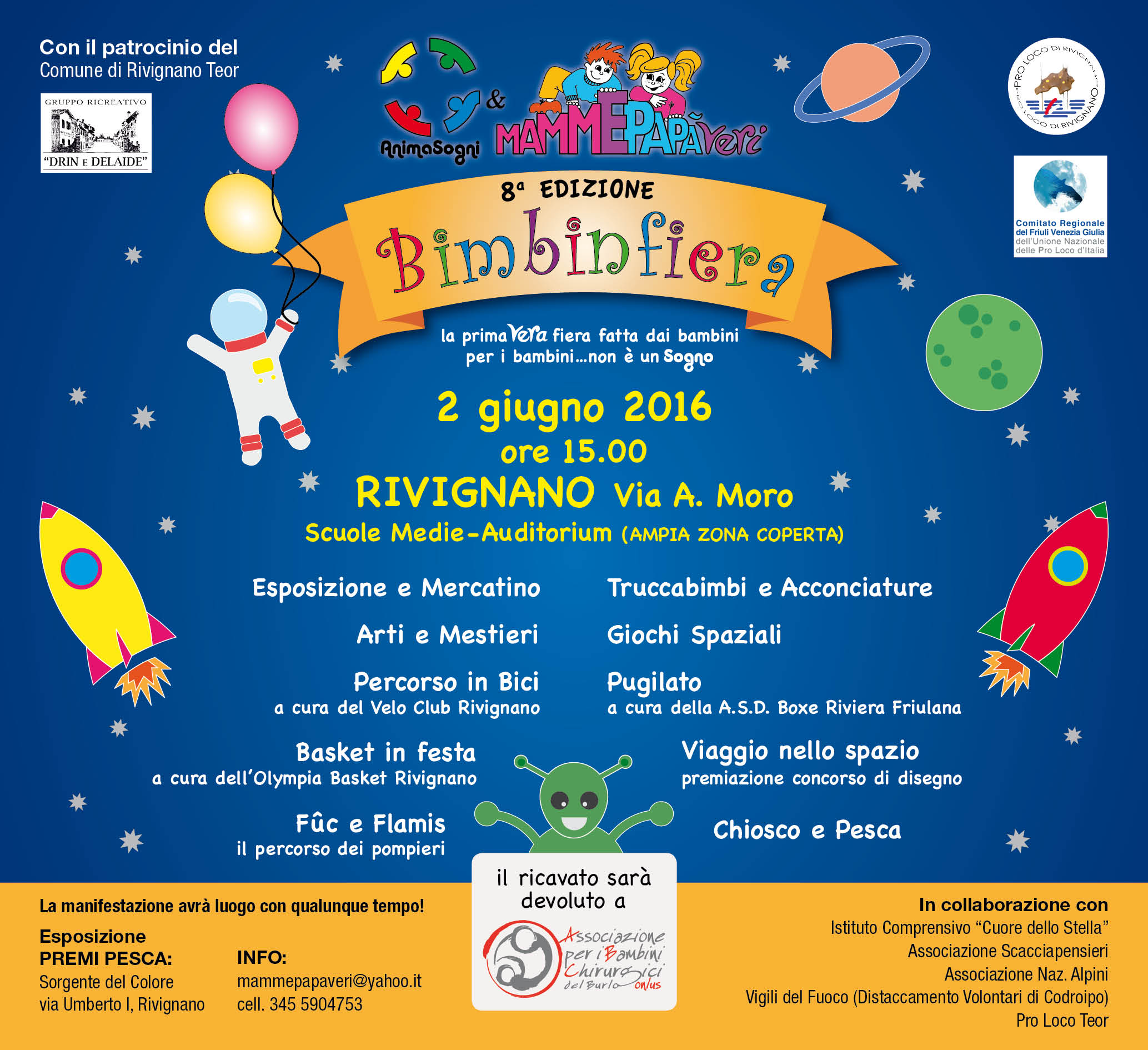 Siamo giunti alla 8^ Edizione di Bimbinfiera. La manifestazione ha come scopo di intrattenere i bambini e allo stesso tempo sensibilizzarli nei confronti di chi è meno fortunato e di raccogliere fondi per associazioni non profit della zona che si occupano di minori. Quest' anno il ricavato verrà devoluto all ABC Associazione Bambini Chirurgici del Burlo onlus.