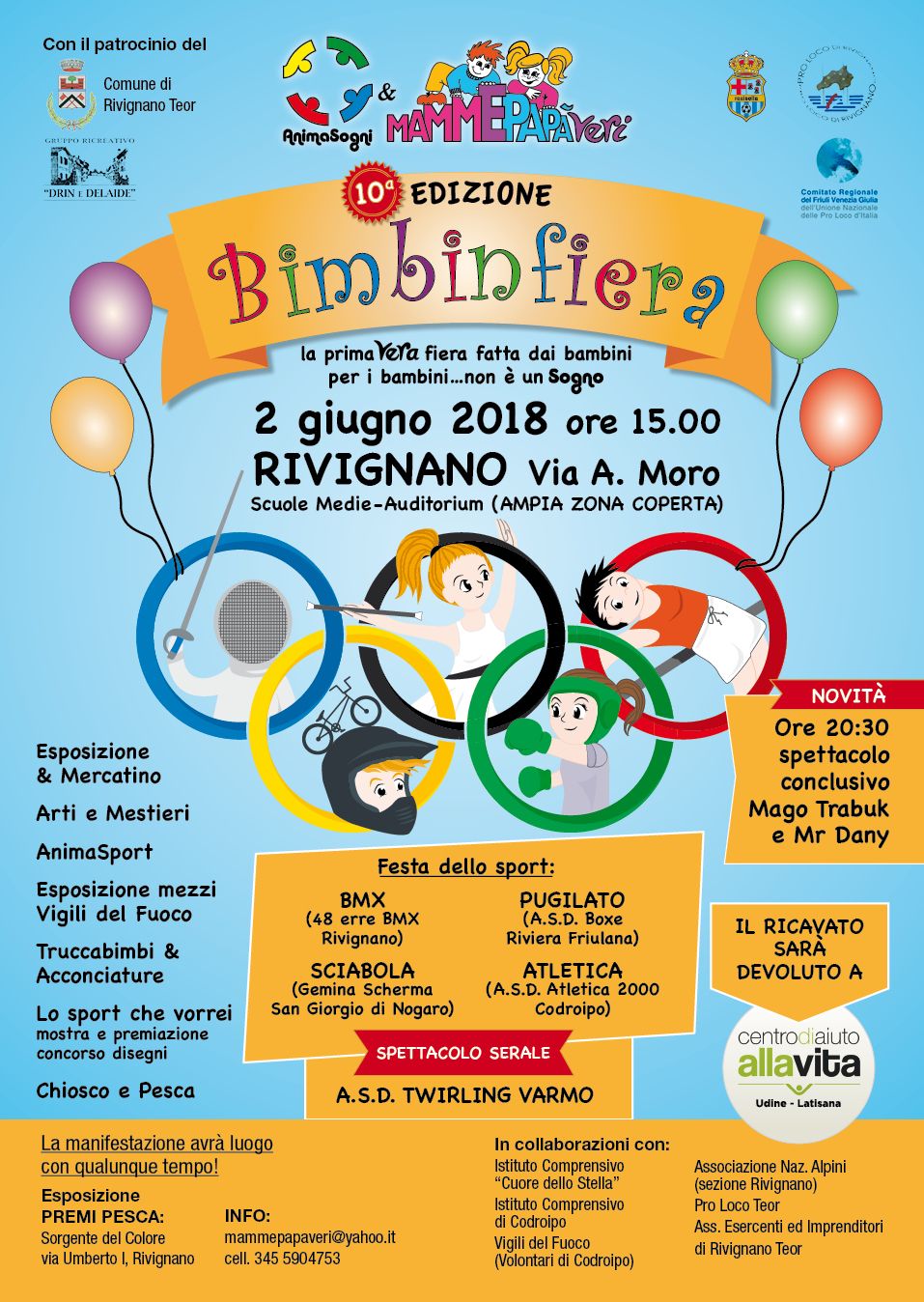 Bimbinfiera, ormai tradizione annuale, ha luogo a Rivignano Teor e negli anni ha raccolto e devoluto fondi ad Onlus della nostra regione che offrono sostegno a famiglie con figli che presentano problemi sociali o di salute.