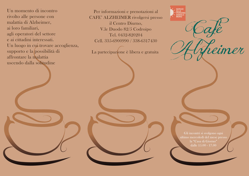 Per informazioni e prenotazioni al CAFE' ALZHEIMER rivolgersi presso il Centro Diurno, V.le Duodo 82/5 Codroipo Tel. 0432-820204, Cell. 335-6900990 / 338-6317 430