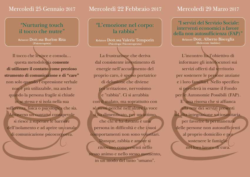 L'incontro ha l’obiettivo di informare gli interlocutori sui servizi offerti dal territorio per sostenere le persone anziane e i loro familiari. Nello specifico si prenderà in esame il Fondo per le Autonomie Possibili (FAP).