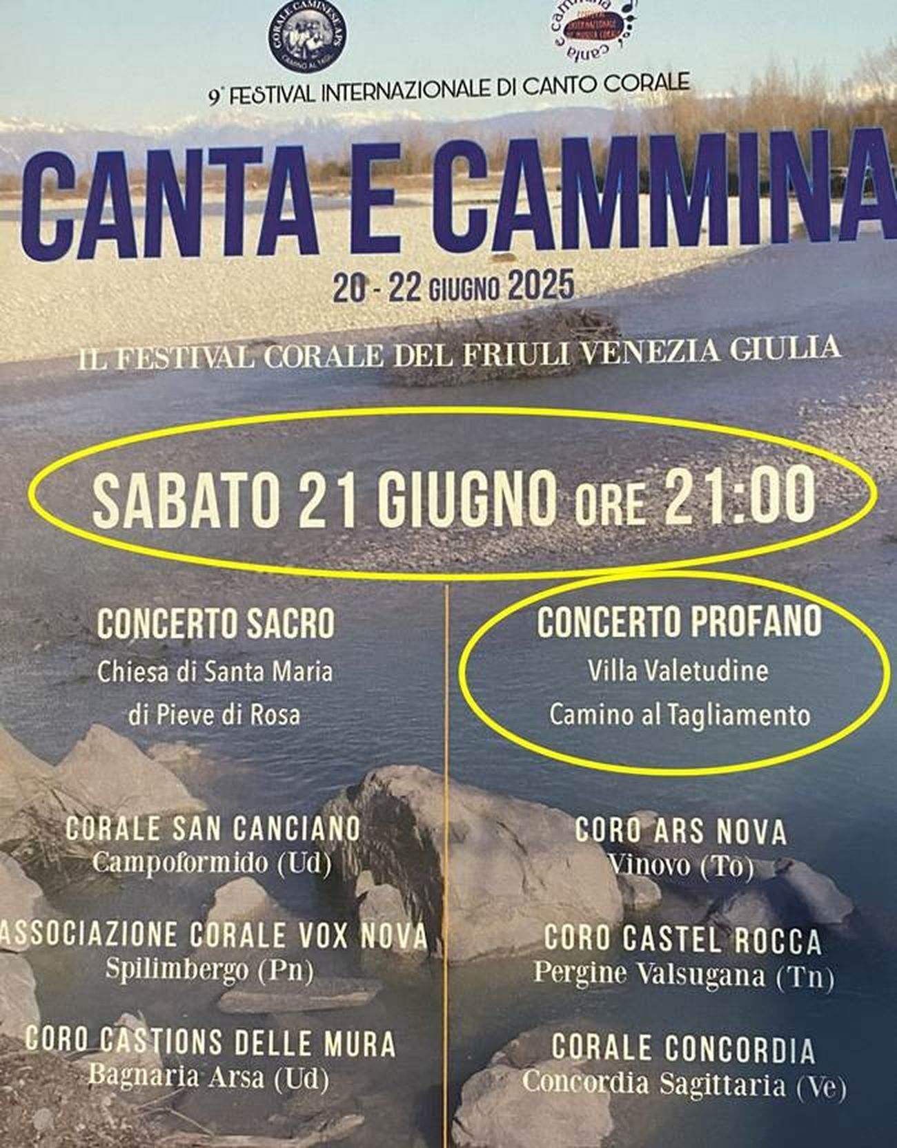 Villa Valetudine ospita ‘Canta&Cammina', Festival internazionale di Canto Corale, con la partecipazione dei cori: Coro Castel Rocca (Pergine Valsugana - Tn), Coro Ars Nova (Vinovo - To) e Corale Concordia (Concordia Sagittaria - Ve).