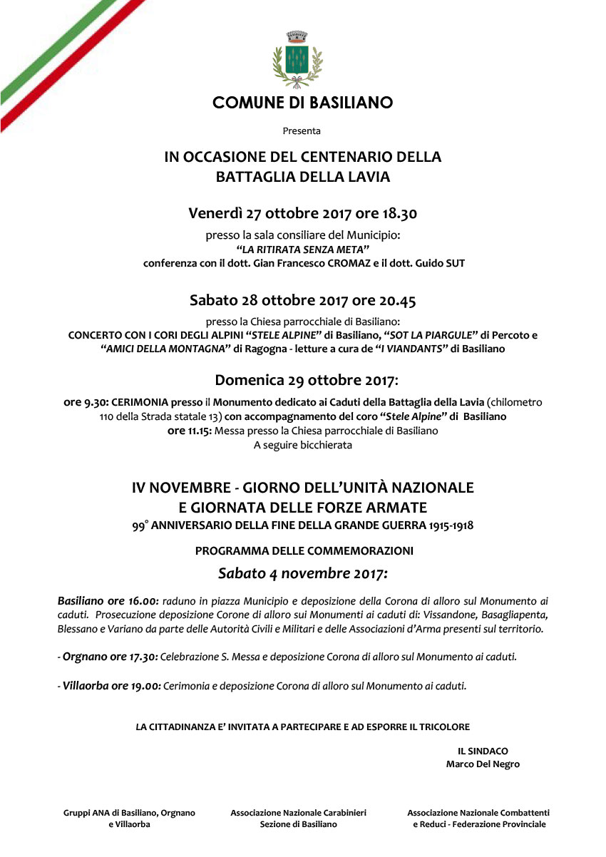 ore 9.30 CERIMONIA presso il Monumento dedicato ai Caduti della Battaglia della Lavia (chilometro 110 della Strada statale 13) con accompagnamento del coro “Stele Alpine” di Basiliano