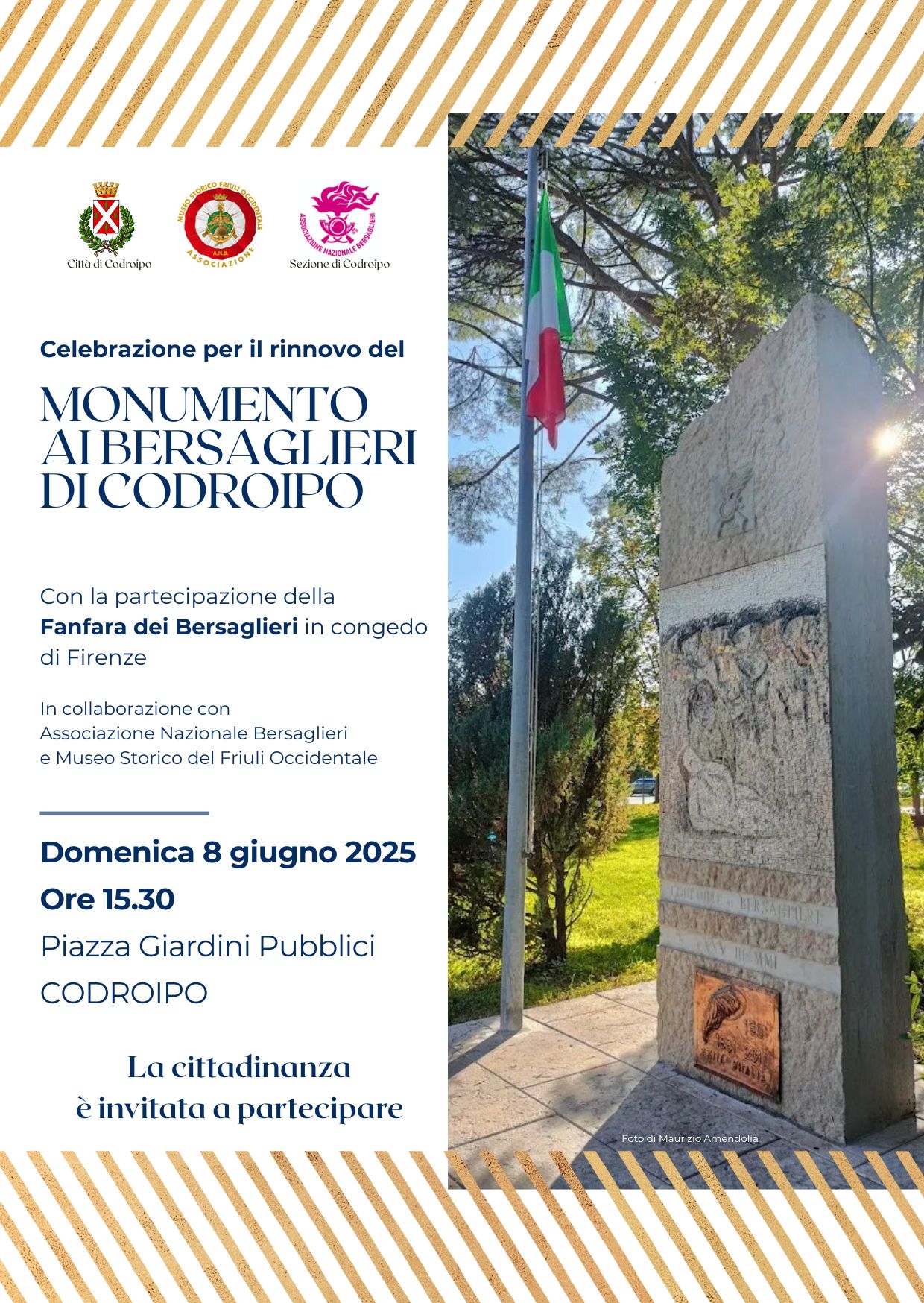 L’Amministrazione comunale di Codroipo in collaborazione con l'Associazione Nazionale Bersaglieri – sezione di Codroipo e l'associazione Museo Storico Friuli Occidentale, invita la cittadinanza a partecipare alla cerimonia di celebrazione del rinnovo del Monumento ai Bersaglieri in Piazza Giardini a seguito dei lavori di pulizia e restauro effettuati dall’Amministrazione comunale nel 2024